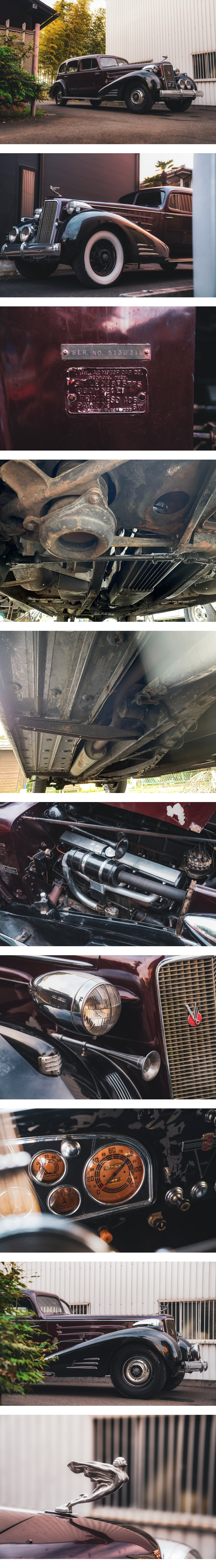 オークションの最高入札者にお譲りします。再出品はしたくありませんので、確実にお取り引きまでさせて頂きたく、 過去評価からお取り引きが難しいと感じられる方の入札はこちらの独断で随時取り消しさせて頂きます。 落札後のキャンセルは一切お受けできません。気になる部分がある方は入札前に下見してください。 10月28日までに支払い手続きが出来ない方は入札をお断りいたします。 当たり前ですが、直前で取り消したり見せかけで落札したりといった車屋さんの常套手段はあり得ません。 必ず売り切りますし、落札した以上必ず買って頂きます。 売り手も買い手も本気というスタンスでお互いオークションを楽しみましょう! ご覧頂きありがとうございます。 Cadillac V16 FLEETWOOD SEVEN PASSENGER LIMOUSINE不動現状車です。 1937年式のフリートウッド社製のリムジンボディを纏った逸品です。登録書類はありません。 キャディラック V16とは 1930年~1940年まで製造されたV16はキャディラックの黄金時代を象徴する一台で、とあるサイトのデータベースによれば10年で1224台が製造されたそうです。 実はV16には大きく分けて2世代、もう少し細かく言えば3世代に分類され、クラシックカーの世界では大別した2世代をGeneration 1、Generation 2と分類し1937年までと1938年以降で分別します。 前者は45度のバンク角、後者は135度のバンク角を有するV16を搭載し、年間数万台生産する中で1%にも満たないV16モデルを途中で新設計するという気合の入れようでした。 Generation 1の中でも33年までが大きな平面ライトがある前期に対し、34年以降はグリルがスラントしこの年代で流行した砲弾ライトを有した後期が存在します。 全生産台数を世代ごとに細分すると大きな平面ライトを有するGen 1の前期が498台、砲弾ライトのGen1後期が212台、エンジンが新設計のGen2が514台製造されたそうです。 今回の出品車両は正にその一番少ない砲弾ライトを備えたGen 1に該当します。 戦後型の派手で煌びやかなギラギラと装飾されたスタイルとは違い、実にフォーマルで上品な佇まいを持ち合わせ、しかしその圧倒的な存在感がただならぬ威圧感を醸し出しております。 当時のキャディラックのラインナップはこのシリーズ90というV16専用モデルの他に、V8もV12も同じようなデザインで統一していりました。カタログ写真の上下でもお判りいただく通り V12以下のモデルがラジエターグリルとフェンダーアーチ前端がほぼ同一線上に並ぶのに対し、V16のみその長大なエンジンを押し込むべくフロントアクセルが前進し、グリルよりフェンダーアーチ前端が大きく前に迫り出す形になっています。 また、V12以下のモデルはフロントフェンダーを後部へ下降していった後フロントドアに差し掛かる部分で大きく切り落とされた様な形になっていますが、V16のそれはフェンダー前端が前進したことにより大きく緩やかに滑らかに下降し、ドア前部で綺麗に収束するスタイルを採ることが出来ています。 V8やV12でも当時の日本では目にする機会は滅多になかったようで、巨匠小林彰太郎氏の著書でもV8をようやく一台見つけてその圧倒的なスケールに感銘を受けたと書かれていました。 全てを調査したわけではないので、もしご存じの方がいらっしゃれば是非質問に入れて頂きたいのですが、恐らく砲弾ライトを有したV16は国内の博物館にもどこにも置いてないのではないでしょうか。 プライベーターで大型ライトのGen 1を所有されている方は拝見したことがあります。 ちなみにこのV16、452cu.in=約7407ccの総排気量から185HPを絞り出します。ついでに言えばスリーサイズは全長約6100mm、全幅約1975㎜、全高1762mm(カタログ表記から単位換算)でございます。 さて、本題に入りますがこの車両、大変残念なことに書類がありません。日本で登録された形跡もありません(職権打刻などはみあたらない) 元々は実は博物館にあったものだそうです。閉館した後もオーナーはこの車だけは手放さなかったそうです。ですがどうにか口説いて手に入れた方が前所有者様で他にも数十台のコレクションを所有されている方でした。その方が亡くなられた時に運よく人伝に話を頂き私が購入出来ました。 まだまだ永く所有していたいのですが、今仕事で資金を捻出しなければならず、惜しくも出品という運びになりました。 私のところにきてからは特に何も弄っていない状態です。強いて言えば洗車をしたり、内装の簡単な掃除をしたくらいです。 当然のことながら、私も、前所有者さまも屋内ガレージで保管していました。 ボディの状態は上々で、ステップやシャシーなども錆腐食などは無いに等しい状態でかなりシャキッとした印象を受けます。 特にオイル漏れを起こしている雰囲気もなく、ブレーキの張り付きもないのでウインチなどで転がります。重すぎて手押しは不可能でした。 メッキパーツの状態も割と良い状態でマスコットやバンパーなども綺麗です。 ただ、私の購入時からタイヤが2本不足し