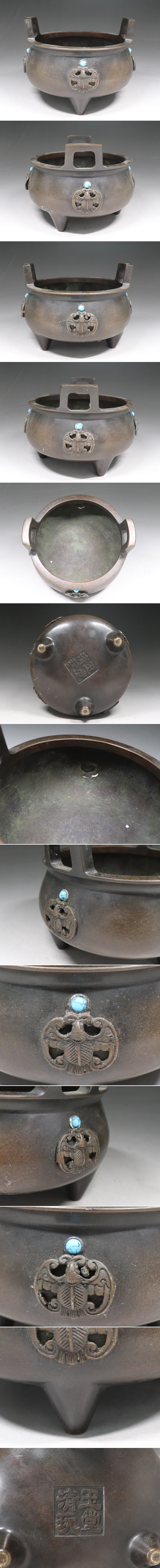 ▲中国古玩・古銅・玉堂清玩・貴石象嵌・三足香炉・双耳・唐物▲se226h 收藏