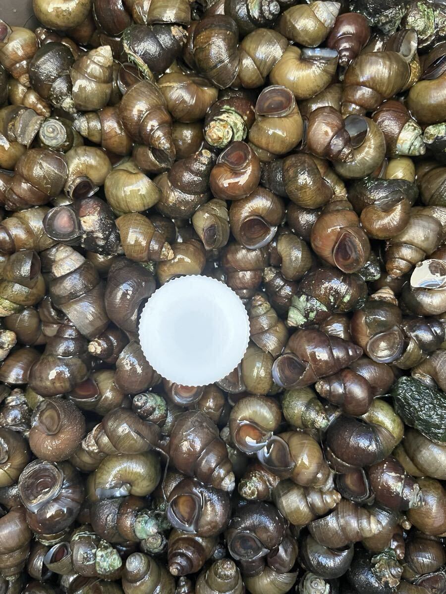 川で取ったヒメタニシ天然個体です。その川にはカワニナやミナミヌマエビを始めとする色々なヌマエビ、ザリガニ、メダカ、シジミ、カワムツ、亀などが住んでいる自然豊な川です。