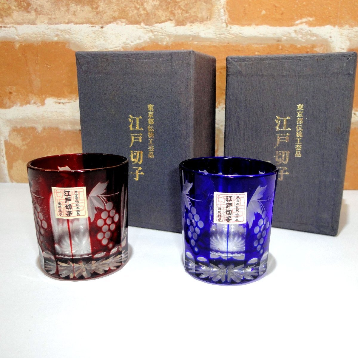 A529 未使用 江戸切子 2点セット 紅 藍 葡萄 ぐいのみ ぐい呑み 廣田硝子 切子 HIROTA TOKYO JAPAN 收藏