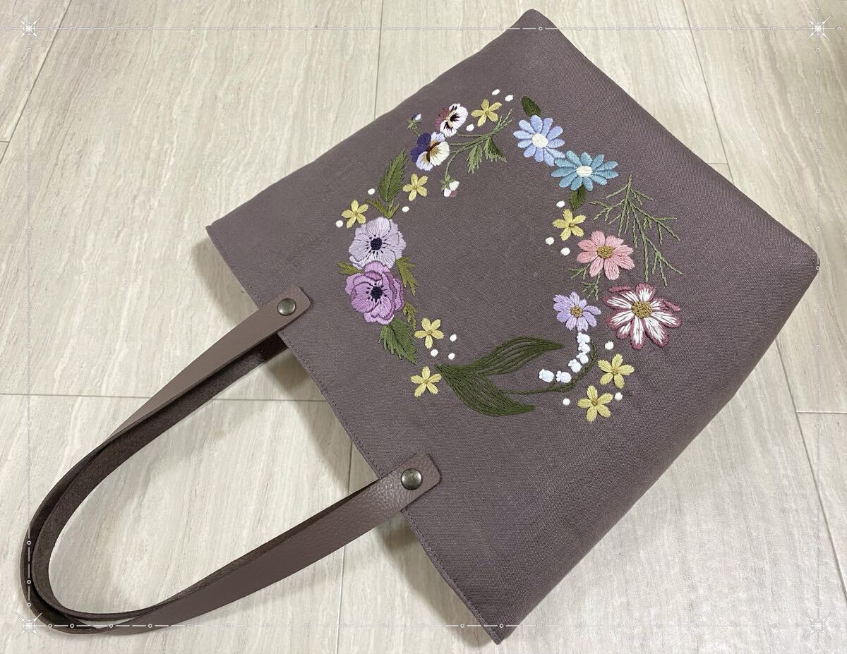 ハンドメイド*リネン×手刺繍*トートバッグ*本革持ち手*アネモネ*パンジー*コスモス*すずらん*ラベンダー*花 刺繍 收藏