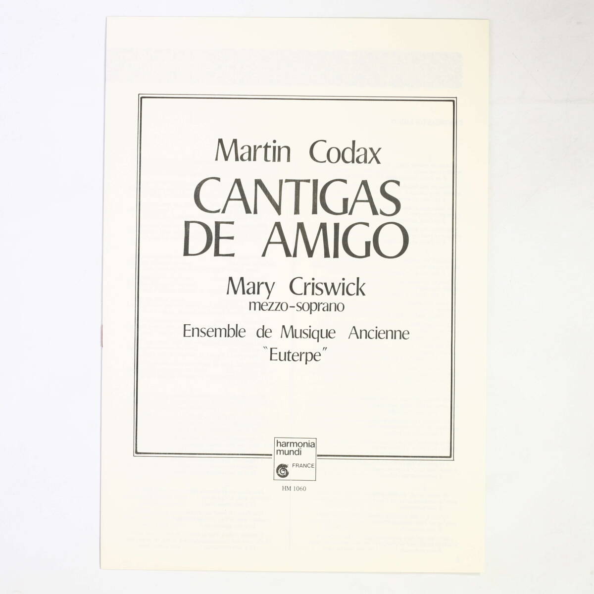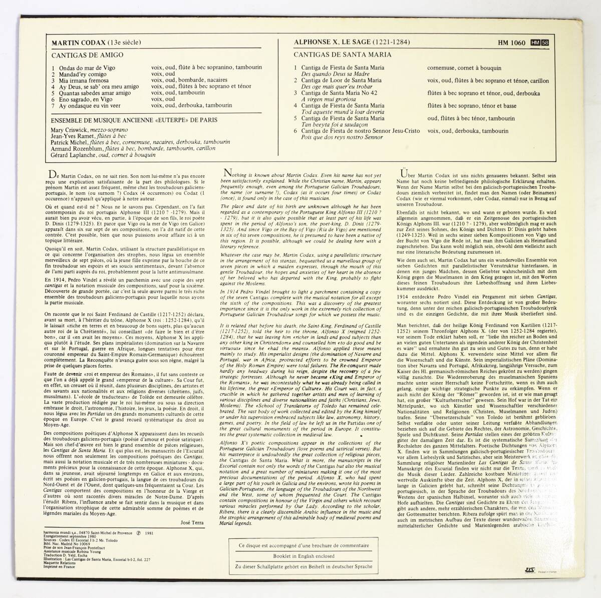 Mary Criswick,Ensemble De Musique Ancienne "Euterpe"/Martin Codax:Cantigas De Amigo 並良品 フランス盤 ライナー付 13世紀のガリシアのトロバドールの作品「七つのカンティーガス・デ・アミーゴ」 B面はアルフォンソ10世の「聖母マリアのカンティガ集」 未CD化
