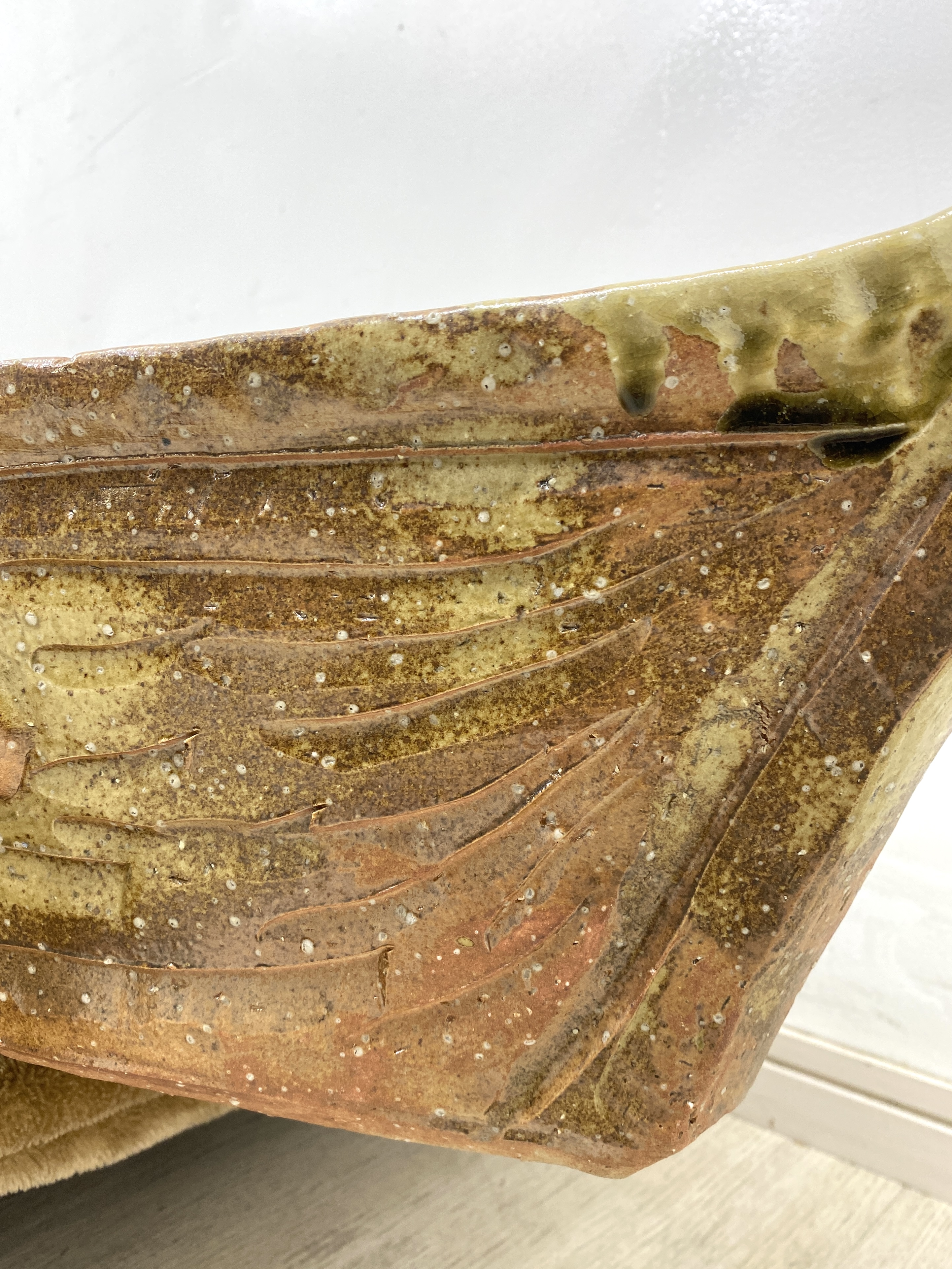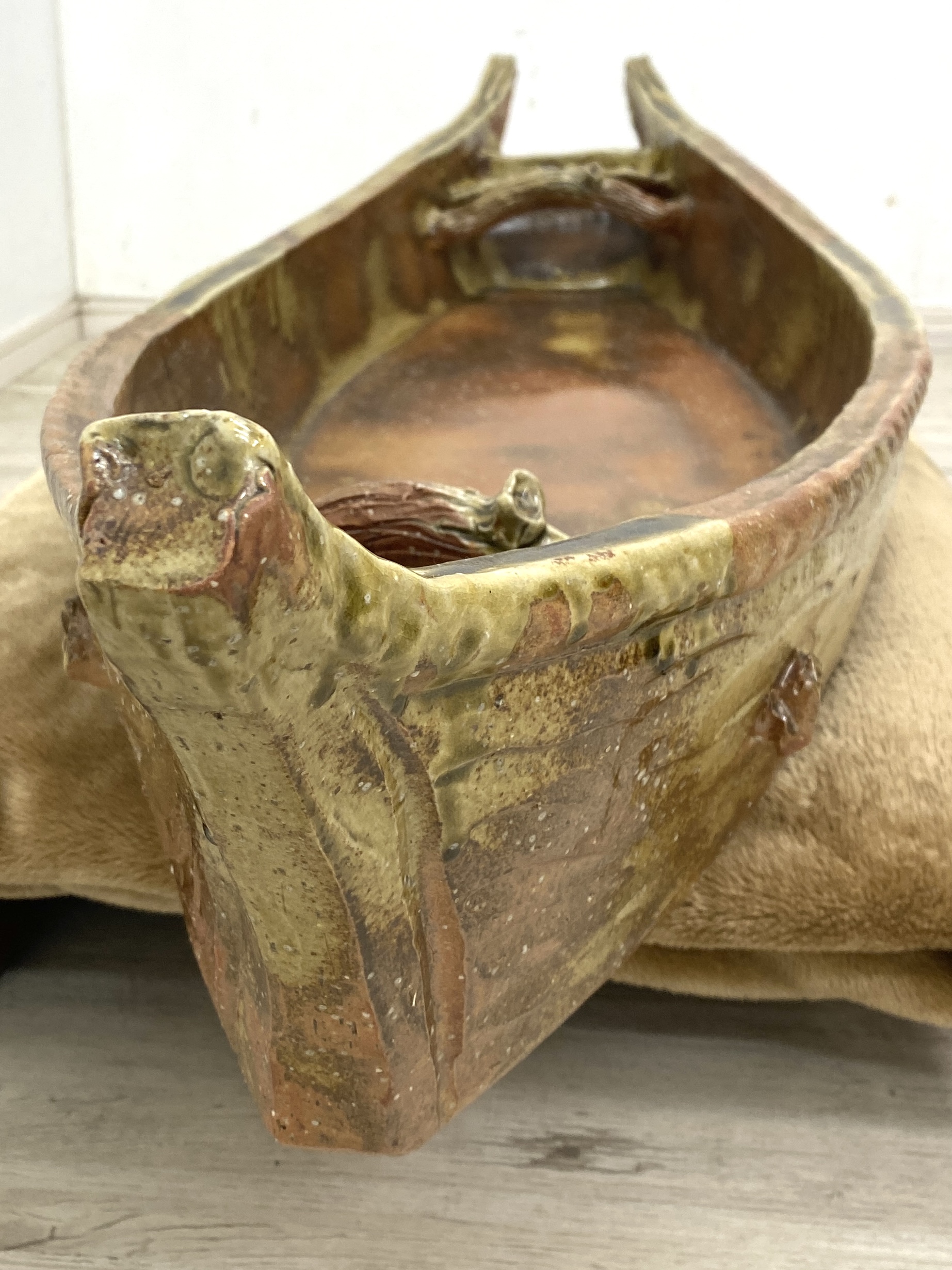 こちらは信楽 舟形水盤です。 中古品です。 信楽焼の舟形水盤のご紹介です。 サムネイルで比較用に500mlペットボトルも一緒に撮影しておりますが、全長約1560mmの特大サイズの花器です。 水盤とは生け花(華道)の道具として、水を入れて植物を活けるために使用される道具です。 信楽焼の土質を生かした素朴な土味が最大の魅力で、舟形のように流れるような形は その独特の形状から美術品として飾っていただいても素敵です。 樹木の枝をイメージした持ち手部分は細部まで丁寧に作り込まれ、豊かな表情をお楽しみいただけます。 風情のある落ち着いた趣ある佇まいで、花や植物を引き立ててくれそうな素晴らしい逸品です。 【コンディションについて】 気になるキズや使用感はなく状態は良いと思います。広い空間の装飾やインテリアの主役として、 雰囲気良くディスプレイして頂けるお品となっています。 他詳細については下記画像も併せてご参照ください。