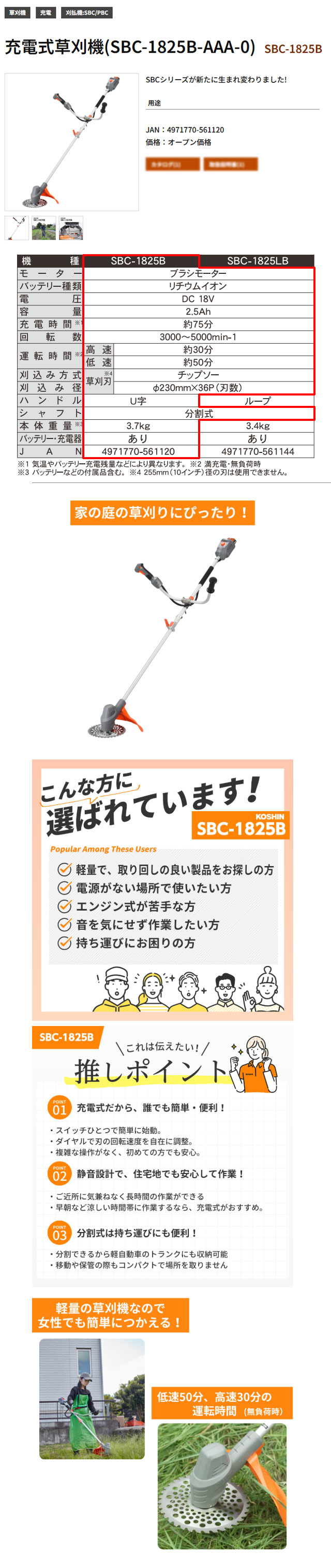 工進 18V充電式草刈機(刈払機) SBC-1825 を出品いたします。 ■特徴■ 家の庭の草刈りにぴったり! 充電式だから、誰でも簡単・便利!