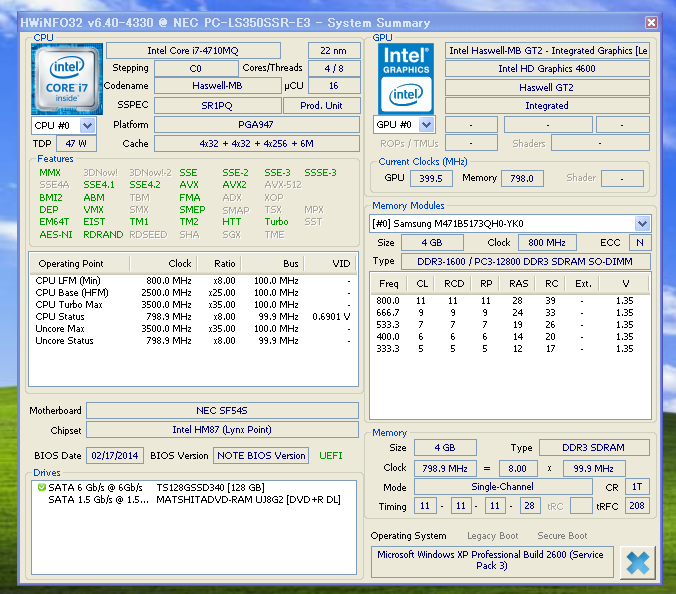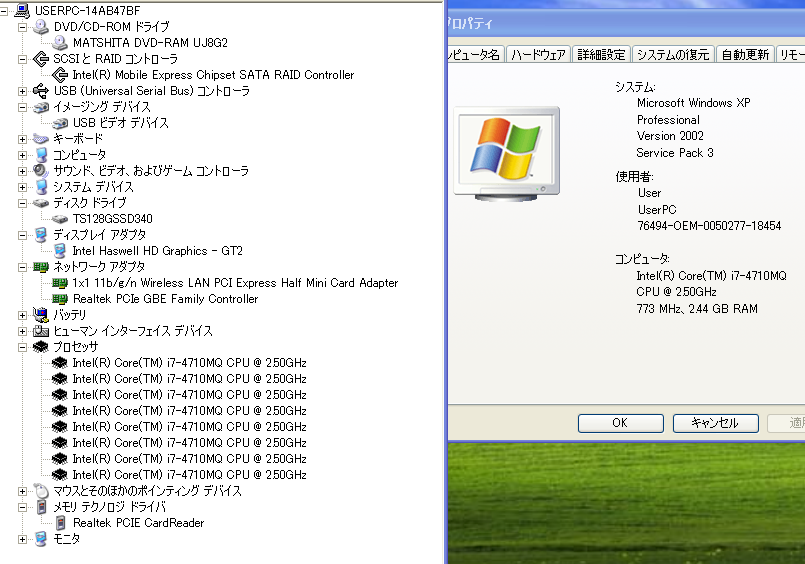 | CPU | インテル Core i7-4710MQ (4コア、2.50GHz) |