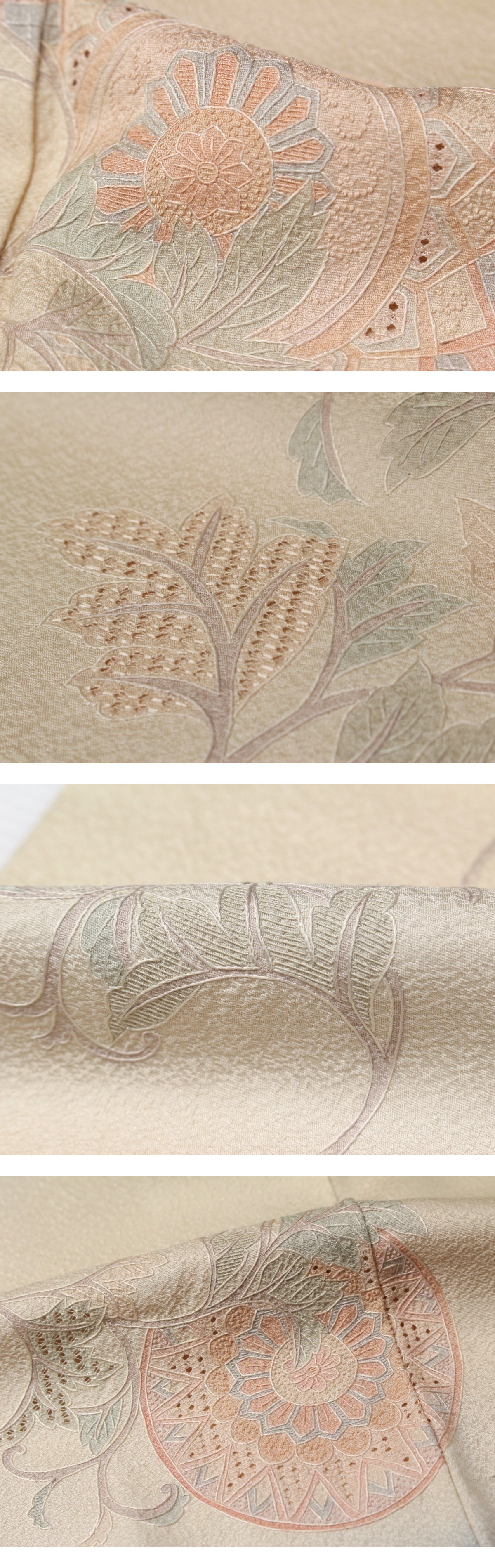 不要な華美を抑えた、品格漂う正絹色留袖のご紹介です。 手仕事ならではの美を伝える蘇州刺繍と汕頭刺繍。 蘇州刺繍は、中国四大刺繍のひとつに数えられる伝統技法で、極細の絹糸を使い、絵画のような柔らかい色調と陰影を生み出す繊細な表現が特徴です。 一方、汕頭刺繍は布地を切り抜いたり、透かしを施したりして立体的な陰影を作る技巧的な刺繍で、上品な透け感と清楚な印象を添えています。 これら二つの刺繍が見事に調和し、淡彩の文様に優しい立体感と深みをもたらし、着る人の動きに合わせてほのかに光沢を放ち、華やかさと品格が共存する仕上がりです。 手刺繍ならではの美しさをぜひお楽しみください。 ※撮影時の部屋の照明によって画像の色に若干の差がございます。色味に差がございますことをご了承のうえご検討下さいませ。 …状態… 袖口、左前にシミ、汚れあり。その他目立つ難なし。状態良好。 ※全くの新品ではございませんので、記載のない変色やスレ、ヤケ、その他僅かな難がある場合がございます。そのような理由でのキャンセルはお受けできませんので、ご了承の上ご検討お願いいたします。 |