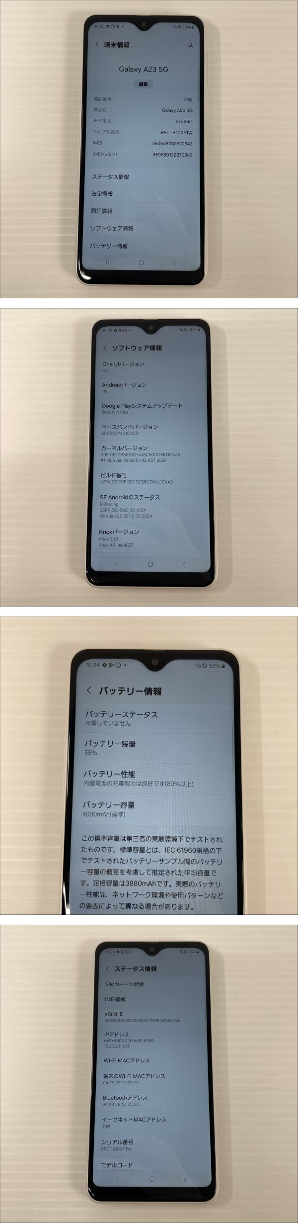 ※他 出品商品との「同梱発送不可」となります。 ※おまとめ依頼があった場合でも「個別取引」となりますので予めご了承くださいませ。 ※弊社指定の配送方法となりますので、配送方法変更不可となります。 (沖縄県は(60サイズ以上の商品)ゆうパックのみでの配送) ※領収書発行可能 (領収書は商品同梱となりますのでメール送信・別住所への郵送はできません) 領収書が必要な場合は、支払完了前までに取引ナビにてお知らせください。 ※落札より2日以上ご連絡が無い場合は「落札者都合でのキャンセル」となります。 ------------------------------------------------------------------------------------------- 【機種】Galaxcy A23 5G 【キャリア】docomo 【容量】64GB 【型式】SC-56C 【カラー】ホワイト 【動作】通電確認済/動作未確認(ジャンク品) ※充電可能/電源入ります(出品時) ※傷・汚れ有。長期保管の中古商品、現状でのお渡しとなりますので、画像にてご確認の上ご入札お願いいたします。美品・完品をお求めの方は入札をお控えくださいませ。 【バージョン】14 【IMEI】 ※利用制限(docomo):〇 【SIMロック】無し ※付属品につきまして、画像に写っているものが全てとなります。 ※商品の詳細につきまして、専門業者ではございませんのでお答えできかねる場合がございます。 ※状態に関して、経年劣化による、小傷や汚れ等はご了承くださいませ。 見落としがある可能性も御座いますので、詳細は画像にてご確認頂き、画像にてご判断頂ける方のみ御入札をお願い致します。 ※電化製品・精密機器等の保証はございません。 | |||