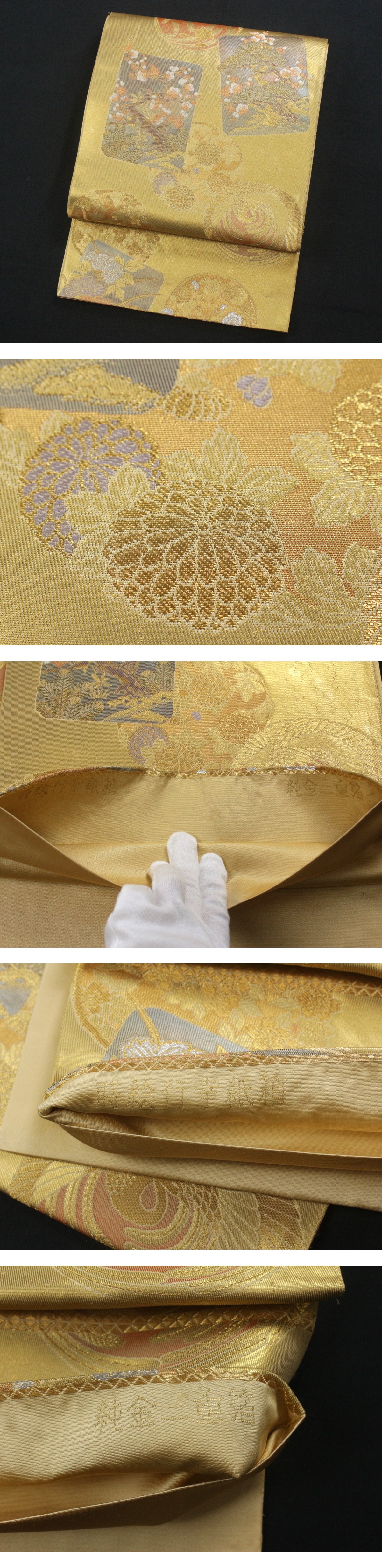 贅沢に用いられた純金二重箔の地に、雅やかな蒔絵行幸紙箱文を配した、格調高い正絹袋帯のご紹介です。 金地ならではの奥行きある輝きが帯全体を包み込み、光の加減によって表情を変える豊かな煌めきが、晴れやかな場にふさわしい存在感を放ちます。 行幸の情景を想わせる紙箱文を中心に、松や草花などの吉祥意匠が蒔絵調に表現され、平安朝の雅趣と公家文化の気品を感じさせる構成となっています。繊細な織り分けと箔使いにより、華やかでありながらも品位を失わない、完成度の高い意匠美が際立ちます。 純金二重箔ならではの重厚感と、正絹のしなやかさを兼ね備え、締めた際にはお太鼓がふっくらと美しく決まります。 伝統技法と意匠美を存分に味わっていただけるお品。 お目に留まりましたら、是非ご検討下さいませ。 ※撮影時の部屋の照明によって画像の色に若干の差がございます。色味に差がございますことをご了承のうえご検討下さいませ。 …状態… 締め跡あり。 ※全くの新品ではございませんので、記載のない変色やスレ、ヤケ、その他僅かな難がある場合がございます。そのような理由でのキャンセルはお受けできませんので、ご了承の上ご検討お願いいたします。 |