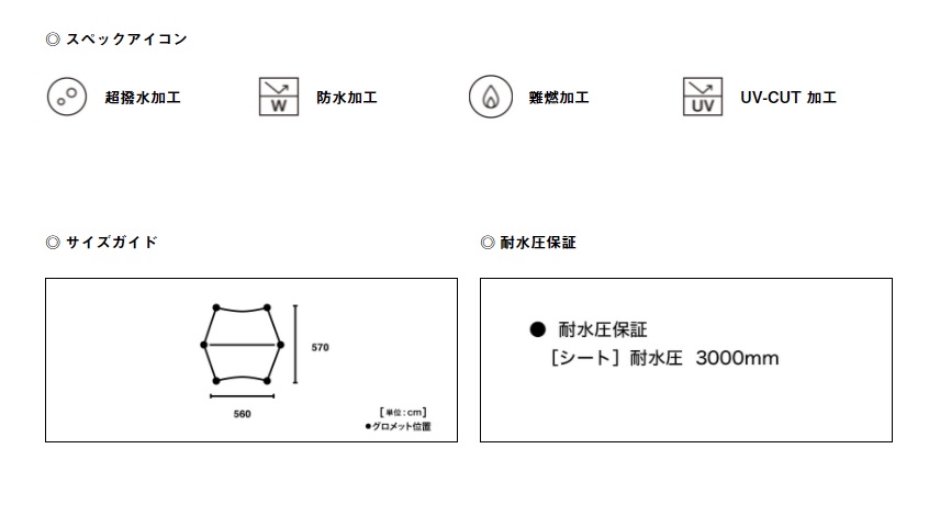 ![]() アレンジ自由自在 炎天下に活躍する大人数対応ヘキサ型タープ 耐風性にすぐれたグランベーシック ヘキサタープに、8人用のXLサイズが登場。裏面にはUV-CUT率99.9%、遮光率100%という驚異のスペックを備え、日向と日陰で最大15℃もの温度差を生み出す「ソーラーブロック加工」を施して、炎天下でも快適なアウトドアライフを実現します(※LOGOS調べ)。今シーズンより、生地とポールを別売にしていることで、手持ちのポールをご使用いただくことも可能です。 ※この商品はシート単品です。 ※230cm以上のタープポールを推奨しています。 ![]() UV-CUT率99.9%以上、遮光率100%!※1 日向と日陰で最大-15℃の温度差を実現!※2 ソーラーブロック加工を施した生地をシートの内側に使用。 紫外線をカットし、太陽光による熱を吸収します。 ※1 生地性能。 ※2 当社テスト結果であり、使用状況により異なる場合があります。 ※生地の特性上、まれに光漏れが生じる場合があります。製品の性能が著しく低下するものではありません。ご了承ください。 ![]() 分厚くて丈夫な難燃ヘビーポリオックス生地 耐風性に優れたヘキサ型で、分厚くて丈夫な難燃性の生地を使用。6ヶ所にグロメットを設けているので、天候に応じてフレキシブルな張り方を楽しめます。 ※写真はイメージです ![]() コーナー部分を補強加工 設営時にテンションがかかりやすいコーナー部分には、生地を重ねることでしっかり補強。 優れた耐久性を実現します。 ![]() |