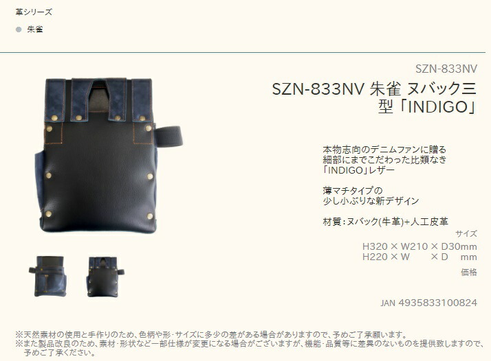 ふくろ倶楽部革シリーズ朱雀 ヌバック三型 「INDIGO」 墨つぼホルダー付SZN-833NV本物志向のデニムファンに贈る細部にまでこだわった比類なき「INDIGO」レザー薄マチタイプの少し小ぶりな新デザイン■仕様材質:ヌバック(牛革)+人工皮革サイズ:H320× W210× D30mm※天然素材の使用と手作りのため、色柄や形・サイズに多少の差がある場合がありますので、予めご了承願います。※また製品改良のため、素材・形状など一部仕様が変更になる場合がございますが、機能・品質等に差異のないものを提供致しますので、予めご了承ください。