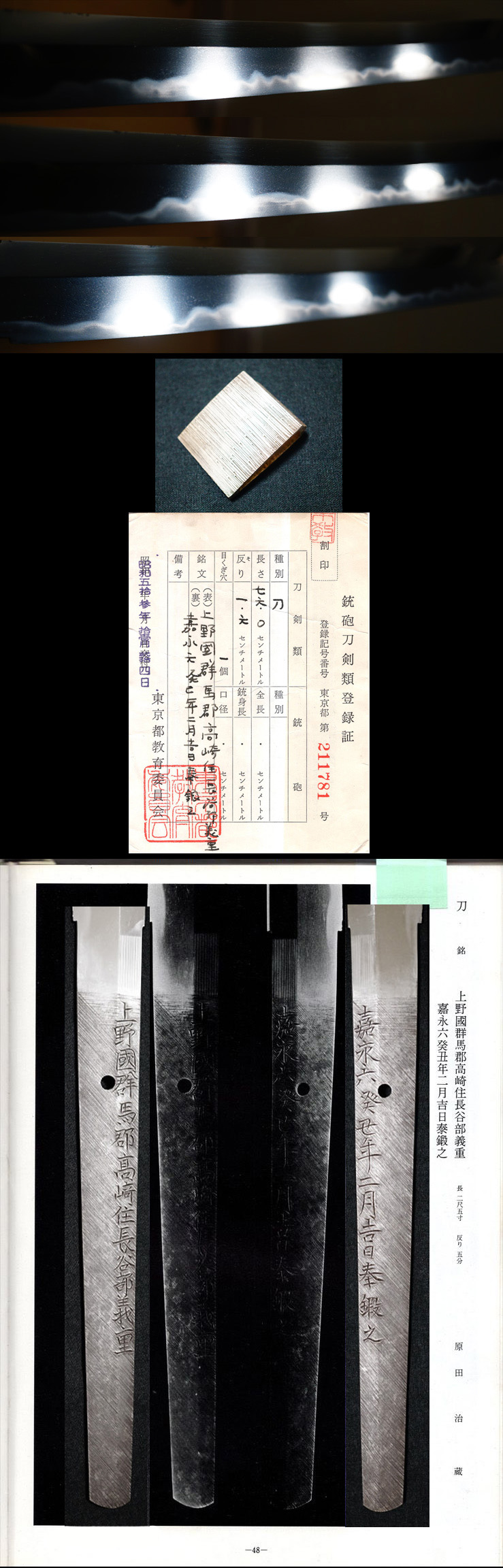 日本美術刀剣保存協会発刊上州刀工総覧所載品豪壮奉納刀『上野國群馬郡高崎住長谷部義重』『嘉永六葵丑年二月吉日奉鍛之』高崎藩御抱刀工 收藏