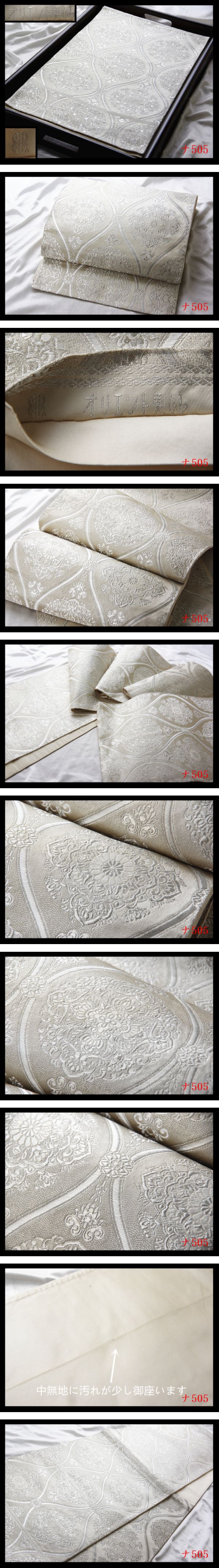 中々上手く撮影出来ないですが、現物は画像以上に、帯の色彩、質感・柄行きなど大変美しい高級品です 職人の技が光る逸品です。 大胆なデザイン★職人独自巧み技 精緻な意匠表現重厚感際立つ美術帯の作品 ★職人の感性と細やかな巧み技★織細な技術とで綾なされた逸品★きめ細かな織が立体感、見る角度によって色んな表情、 織の創作性に富んだ意匠センスが魅力的細緻極まる織り味で表現された豪華な高級感に満ち溢れた日本情緒が匂い立つ意匠の格調高い帯姿を纏う帯です。 優美な意匠はとりわけ華麗な和の真髄を表し 非常に洗練された紋を取り入れた意匠は見る者を圧倒し、ひと際華やかで美しい、堂々とした存在感が漂います。 地色の美しさもまた格別です。文様に使われている様々な色糸も、それぞれに色そのものが上品で美しく、 見ていても飽きないほどうっとりするような洗練された色柄が秀逸です。 繊細な大変上質な高級織物の風合いの良さが息づいた日本独自の古典伝統美 とても綺麗な色い格調超高い★高級帯 お好きな方・お探しでした方は是非この機会にご検討ください。 優美な意匠があしらわれた袋帯です 吉祥の気配漂う意匠をお楽しみください、 かっこよくエレガントな雰囲気も期待できます 高価な高級袋帯はこれより低価で出品する事まずございません、早い者勝ち 同じお品物は二度と出回らない限定の出品で御座いますのでお見逃し無く. 他でも販売していますので、予告なく出品を取り消す場合がございます。 何卒ご了承ください。 注意事項 ーーーーーーーーーーーーーーーーー 中古品にご理解のある方のみ入札をお願いします。 中古品である事を御理解下さい お着物や帯の生地などの伸縮性のため、サイズに若干の誤差がある場合がございます。御了承下さい。 トラブルを防ぎ、商品の状態・判断し易いため 弊社は努力して、色々角度から丁寧に商品撮影しており 商品写真をよくご覧頂き御自身の責任を持って 商品の状態・慎重に判断して入札をお願い致します ノークレーム・ノーリターンでお願いします 他でも販売していますので、予告なく出品を取り消す場合がございます。何卒ご了承ください。 ★1つ1つ実際の商品を撮影し 出来る限り同じ発色に近づけるよう撮影しておりますが、撮影環境、フラッシュを使用している場合があります、 ディスプレイ等の関係で、実物の色と多少異なる場合がございますのでご了承下さいませ 商品画像は撮影後に画像の編集は一切行っておりません。 ※商品は画像の物が全てです。 お客様ご使用のブラウザやパソコンのモニター環境などによっては、多少色合いなどが実物の色と異なって見える場合がございます。 画像色の淡濃が実物の色と多少異なる場合もございますので、予めご了承いただけますようお願い申し上げます。 未使用のお品に関しましても、あくまで一度人の手に渡った品ですので、完璧なものをお望みの方は入札をお控え下さい。 トラブルを防ぎ、写真、商品説明をよく読みになり、神経質な方のご入札はご遠慮ください 色やイメージ違い等での返品・交換はお受けできません イメージと違う等のクレームは一切お受け出来ませんのでご理解ください。 理解できない方、説明文・画像等で判断つかない方、 同意できない方大変神経質な方は入札しないで下さい。 当店からの説明文・画像等をご納得頂いた上でノークレーム、ノーリターンを厳守できる方のみでご入札お願いします オークションの為、原則ノークレーム・ノーリターンでお願い致します。 ただし、ご到着の品がご落札の品と違った場合や寸法などが商品説明と著しく違う場合は、お手数ですが商品到着後、 3天以内に連絡掲示板にてご連絡ください。誠意を持って対応させていただきます (商品到着後3天を過ぎた場合は対応いたしかねます)。 商品到着日に関してですが、商品到着日指定のご連絡がない場合、商品発送日の翌日(九州)または翌々日(北海道・本州・四国・沖縄)を到着日とさせていただきます。 予めご了承ください。 当方商品は中古として取り扱っております。 【新品出品するの場合明記致します】 経年に伴うシミ汚れ等のチェックには注意を払っておりますが、見落としがある場合もございますし、 ★箪笥に入っておりました着物や帯なので畳みシワや匂いがあるものもございます。 未使用のお品に関しましても、あくまで一度人の手に渡った品ですので、 完璧なものをお望みの方は入札をお控え下さい。 瑕疵の状態に関しましては、個々の見解の違いがありますのでご了承ください。 細かい瑕疵等が画像で確認できない場合がございます。 ご入札ご落札後は瑕疵の状態についての保証はいたしかねます。 実物との色合い誤差を無くす為、極力丁寧な撮影を心がけておりますが、パソコン上で表示される色は各モニターの性能や設定により異なる場合がございます。 予めご理解の程よろしくお願いいたします。 お客様画像を