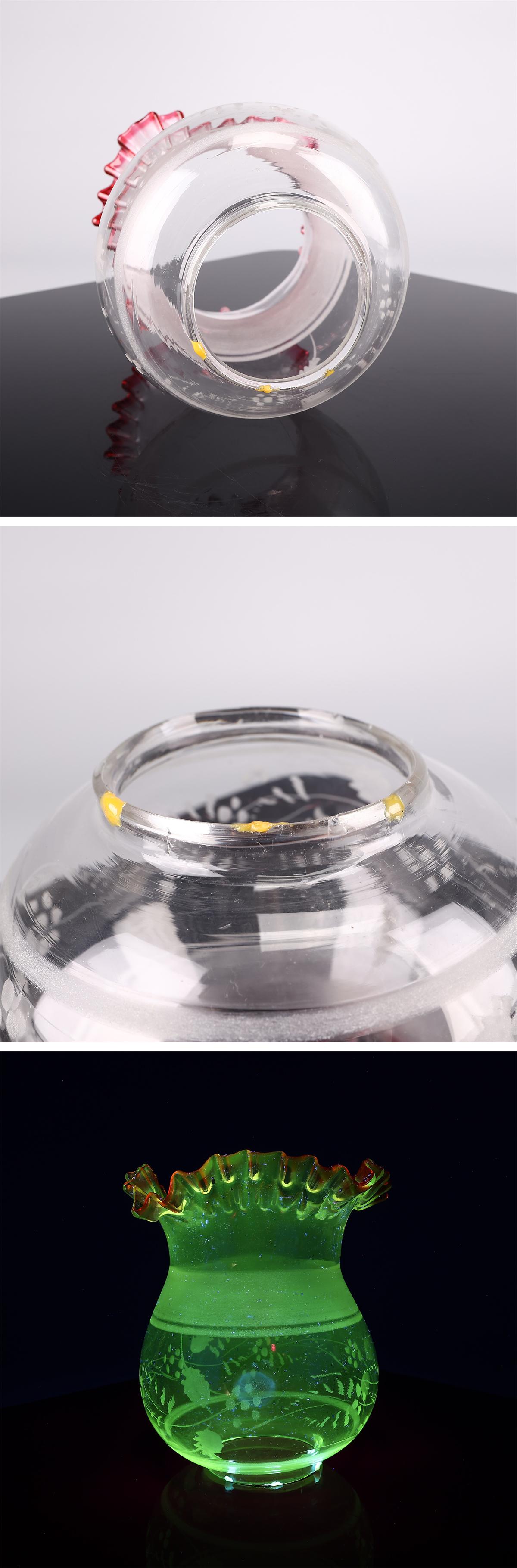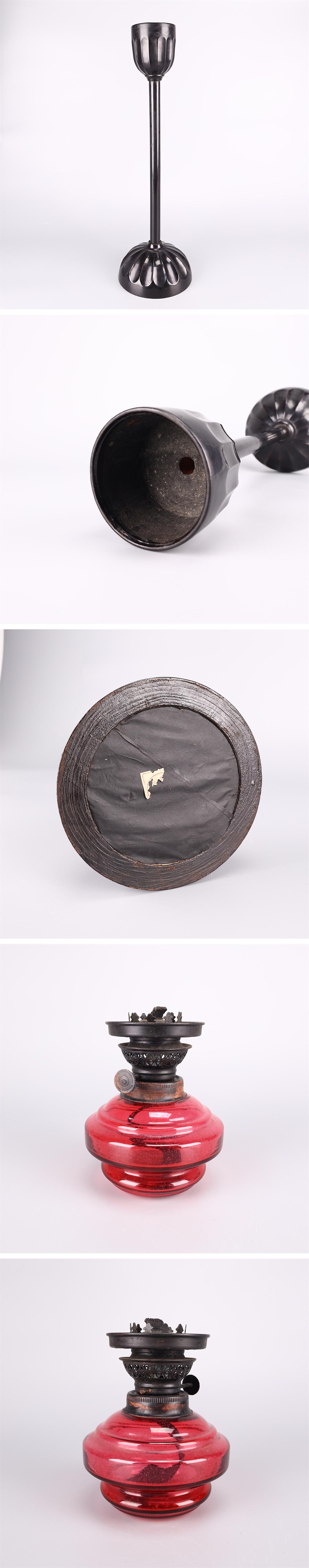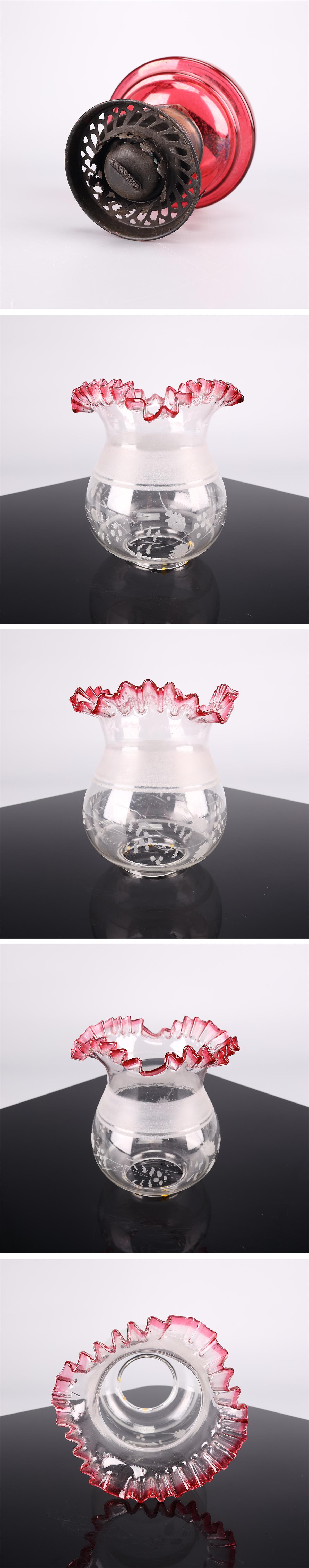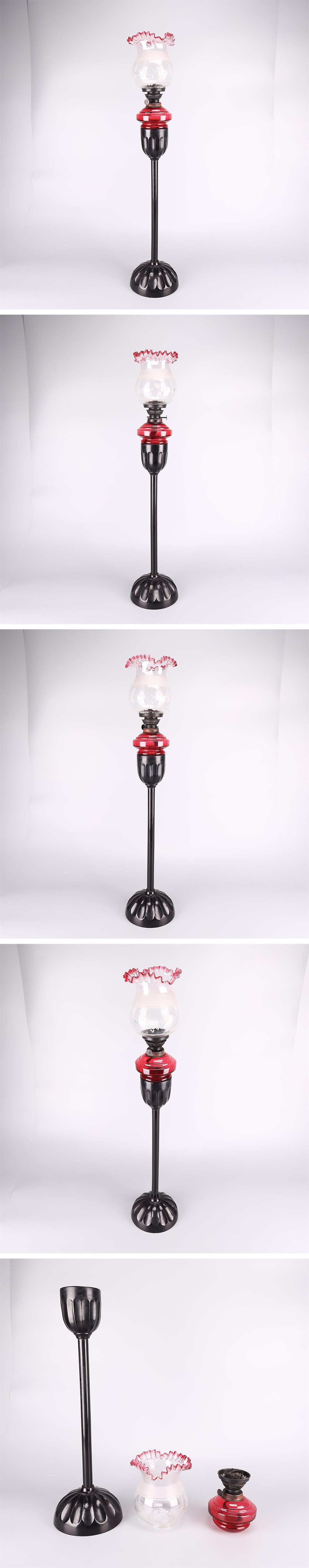 【吉】ZD867 江戸時代 【ウランガラス】 赤硝子タンク 赤縁フリルランプ笠 灯油ランプ 照明 高85㎝/時代の汚れあり! 收藏