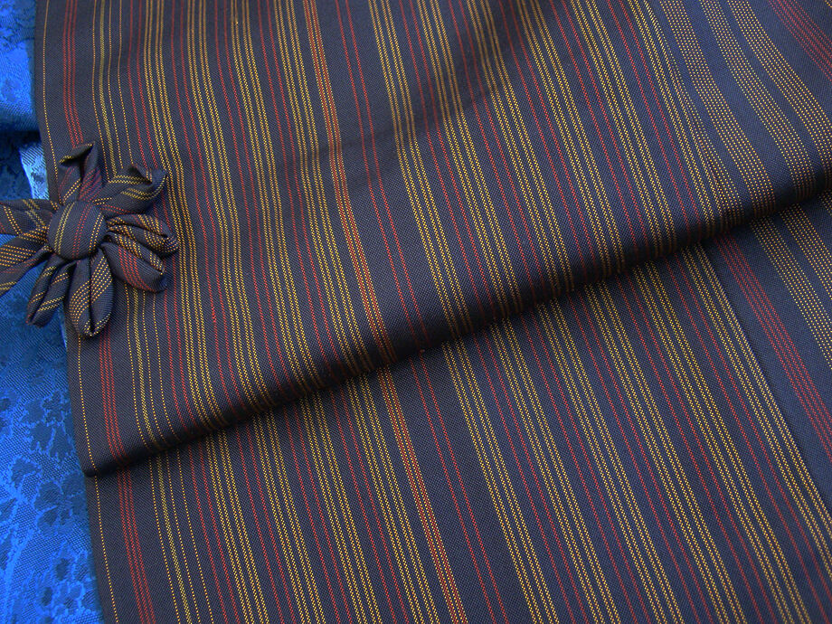 | 商品説明 | 本場大島紬特有の大変にさらりとした生地は裾さばきがとても良く、ハリやシャリ感も堪能でき 着心地が良いため、現代のお洒落着として大変人気がございます。 大島特有の肌触りと心地よい絹なりが、お洒落心をくすぐる事でしょう。 大変滑らかでシャリ感のある地全体は、 黒、エンジ、国防、金茶色の縞柄、 リバーシブル仕立て、裏面はサファイアブルー色地に花草柄、 また残念ながら証紙・残布はついておりませんが手触り等から大島紬と思われます。 |