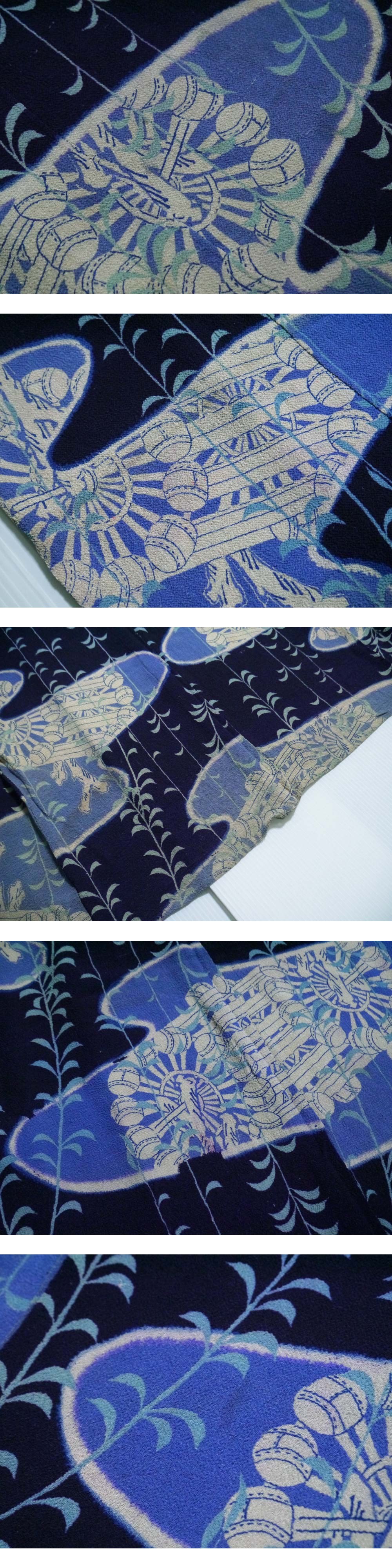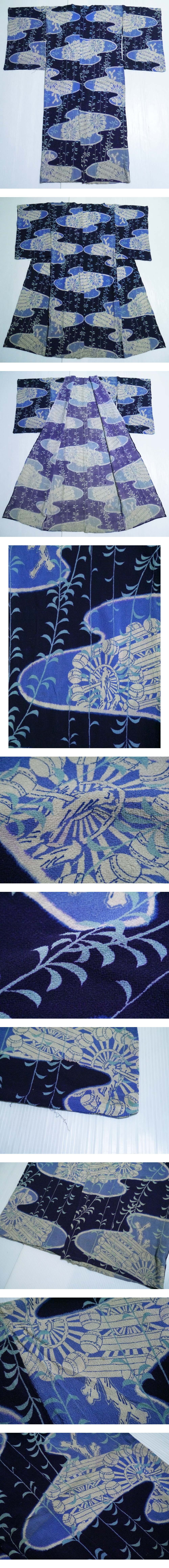 【KIRUKIRU】アンティーク 長襦袢 正絹 縮緬 ちりめん 大正ロマン 紺 青 柳と水車 レトロ 着物 古布 古裂 リメイク 材料 生地 人形細工 收藏