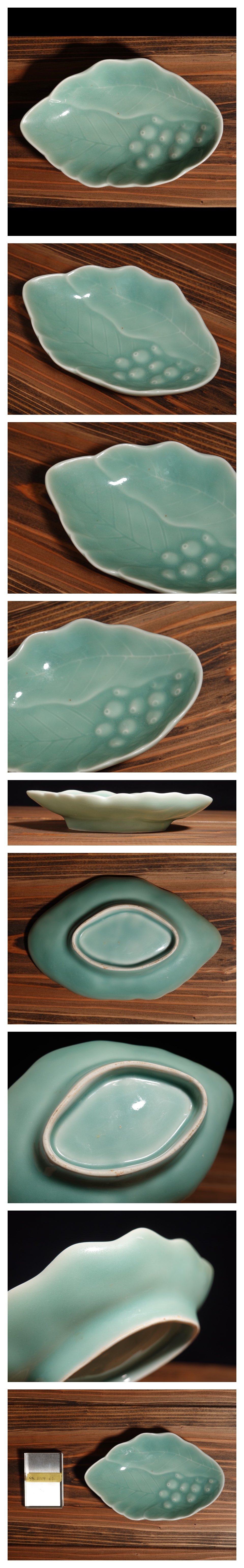 【聖陽堂】江戸時代 後期 鍋島藩窯 『 青磁 鞘豆文 陽刻 葉形 変形皿 』 小皿 鍋島青磁 図録同手掲載 【向付 取皿 銘々皿】 r8 0114 01 收藏