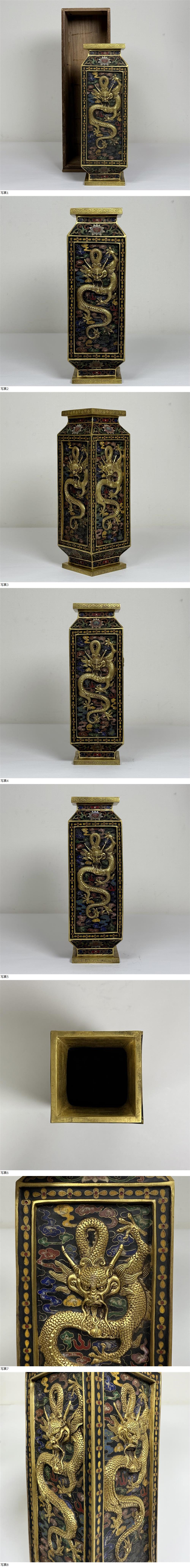 X-中国古美術 時代物 花瓶 四方型 古銅 七宝焼 景泰藍 龍図 在銘 乾隆年製 蓋なし箱付 唐物 中国古玩 骨董品 古董 收藏