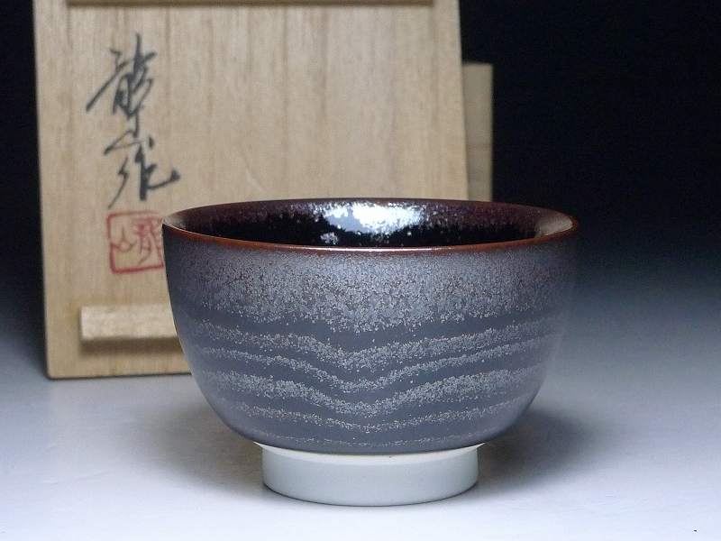 60HT218★有田焼 青木龍山窯 青木龍山造 天目渚ぐい呑 天目釉 曜変天目 共箱 ぐい呑 酒器 酒杯 お猪口 收藏