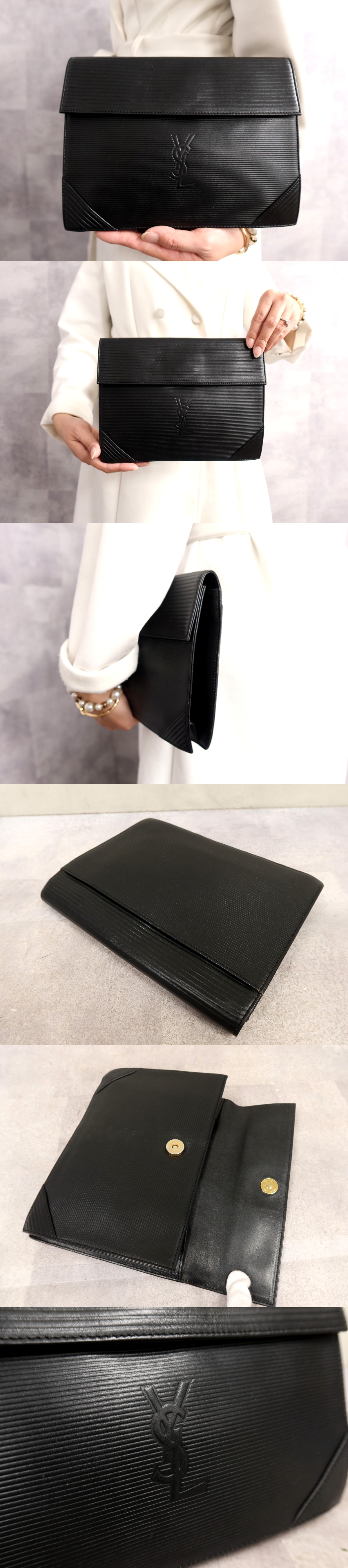 ●超美品●YSL Yves Saint-Laurent イヴ・サンローラン●カーフ レザー 本革●セカンド クラッチ バッグ●黒●ゴールド金具●収納●Js64602 收藏