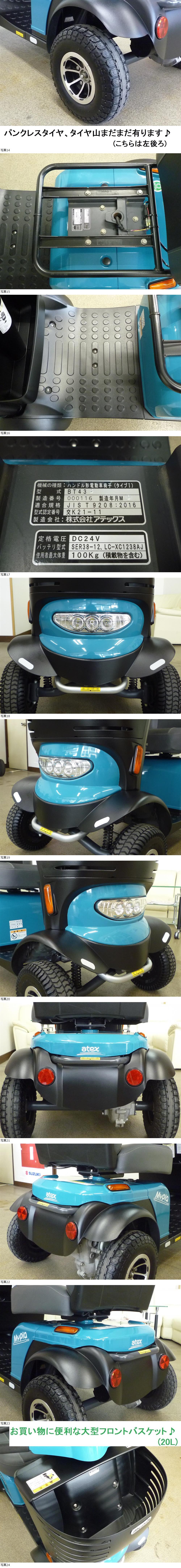 | 商品紹介 | ★★★完全売り切り致しますので宜しくお願い致します★★★ 下記詳細以外に気が付きましたら追記させて頂きますので、 オークション終了まで随時注意してご覧下さい。 四国・愛媛県松山市より★美車★出品です。 ★現車確認、試乗大歓迎です★ 現車確認、試乗は日曜、祝日と第1・第3・第5土曜日以外の 午前9時~午後19時の間に 弊社、店舗(松山市福音寺町488-4 1F Again株式会社)までお越し頂く様になります。 詳しくは質問欄よりお問合せ下さい。 中古車、現状渡しの為、なるべく現車確認をオススメします。 写真多数アップしてます。 こちら をクリックしてご覧下さい。 (約70枚アップしてます) 上記クリックで閲覧できない場合は、 下記リンクをコピー&ペーストして詳細写真ご覧ください。 https://www.dropbox.com/scl/fo/valpl582a2vfuvt3rzrzv/AH_g1Q_1MdI01lgQtkUDKJA?rlkey=zsxtl9oyvqwfhif0u4sfh5y77&st=u0xyo05d&dl=0 新車ワンオーナー まだまだ美車と言って良いレベルだと思います♪ 目立つ傷もありません。 ボディーの黒い部分は元々グレーに近い色ですが ブラックにコーティングしており、カッコよくなっていると思います♪ ハンドル部分も綺麗な方だと思います♪ 座席シートは多少使用感や汚れなどあります。 バッテリーも新品交換済で、まだまだ活躍してくれる1台となっております♪ 個人的主観もありますので、車体の状態は 詳細写真や現車確認にてご確認頂き、ノークレームにてご入札お願い致します。 音声案内タイプ♪ デジタル表示♪ バッテリー新品交換済♪ パンクレスタイヤのタイヤ山もまだあります♪ 即決特典有り♪(中古品ですがステッキホルダー取付てご発送) atex アテックス マイピア (シニアカー セニアカー 電動車 介護用品 四輪電動車いす) 型式 BT43 製造番号 000116 製造年月 2021年11月製 (2026年1月下旬時点で製造後4年2か月 走行距離760kmとなってます) カラー マリンブルー 青系 鍵は全部で2本あります。 電動車いす手引き(小冊子)、 印刷した取扱説明書もお付けします♪ 動作良好♪メンテナンス・清掃もしております♪ ★新品バッテリー交換済です(純正同等LONG製WP40-12NE) よって1回の充電で約5時間(約30km)、連続走行可能です。 (ご使用環境、季節等によって多少変動します) 満充電時はバッテリメータの残量を示すバーの数が5 本ですが 走行するにしたがい、右端から1 本ずつ消えていきます。 バッテリメーターのバー1本分で走行できる距離の目安は、 平坦な道路で約7.5kmです。 残り2本からは、バー1本分で走行できる距離は約3.5Kmです。 ●冬期はバッテリのはたらきが鈍るため、夏期にくらべて走行できる距離が、 2~3割短くなります。 ● 走行できる距離は、バッテリの劣化にともなって短くなります。 余り減ってない状態で毎回毎回充電するよりも、ある程度放電させた方が良い為 バーが2本減った位から充電するとバッテリーのモチが良いようです。 ★パンクレスタイヤ、前タイヤは後ろタイヤより減ってはいますがまだ有ります。 後ろタイヤはまだまだタイヤ山あります。 --------------------------------------------- ★即決特典有り★ 即決でご落札頂きましたら、中古ステッキホルダー(杖を入れれます)を 無料で車体に取付後お渡し致します。 基本的に左側に取付させて頂いてますので、 右側をご希望でしたら早々にお知らせ下さい。 (後に左右取付位置は変えれます) 新車販売価格398000円になりますので、 こちらのBT43型をご購入検討の方は大変お買い得の商品となります♪ 状態も良く、しかも送料込みで出品してます♪ 前進(全速度)、後進、ライト、音声案内、ホーン、音関係動作問題なし♪ ホーンボタンを押しながら、キーを入れるとメンテナンスモードが表示され 昼間点灯ボタンでモード変更できます。 そちらにて使用期間などご確認頂けます。 音量なども変更できます。 充電動作確認済(満充電OK)♪ 家庭用コンセントにて充電し使用します。 鍵を使用しなくても座席シート背面の手押しスイッチを押すと 手動で車体を動かせます。 (バッテリーの残量が有る状態のみ動かせます) ■寸法/全長1195×全幅650×全高1100mm ■シート寸法/全幅425×奥行395×全高480mm ■重量/99kg(バッテリー含む) ■速度(前進)km/h /0.5~6.0無段階 ■速度(後進)km/h /0.5~2.0無段階 ■実用登坂角度/10° ■段差乗越高さ/80以下mm ■溝乗り越え幅/120以下mm ■最小回転半径/1460mm ■連続走行距離/30km(最高速度、平坦路、新品バッテリー) ■使用者最大体重 100kg(積載物含む) 商品説明 ・ハンドル下に充電用プラグを内蔵!家庭用100Vコンセントにプラグを 差し込み充電が終わると自動停止します。 ・引上げ式アクセルレバーを採用。 ・フロント大型バスケットを標準装備。 タイヤの接地幅が従来より20㎜アップ! より安心してお出かけいただけます。 持ち上げハンドルが前後に付いてますので、専用のスロープ等ない場合も 持ち運びが便利です♪ 家庭用コンセントにて充電し使用します。 出品に辺り、清掃もさせて頂いております。 屋内にて駐車・保管して