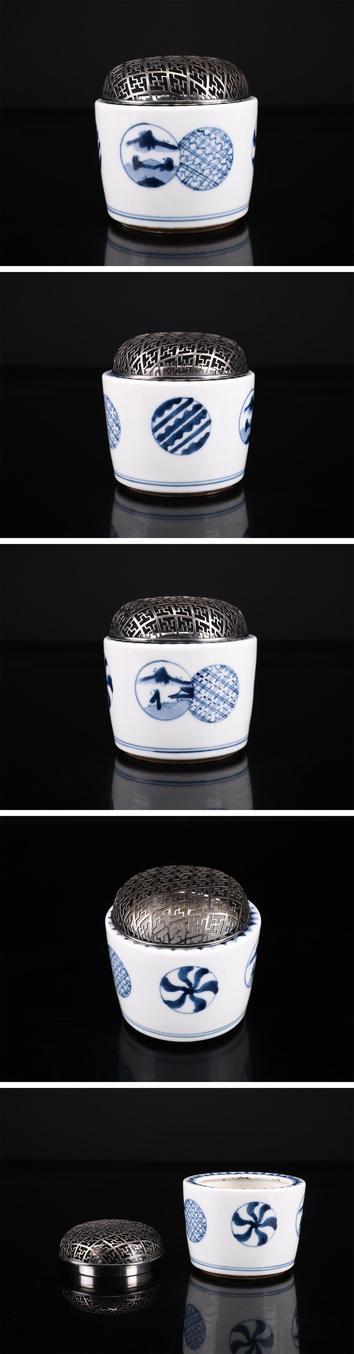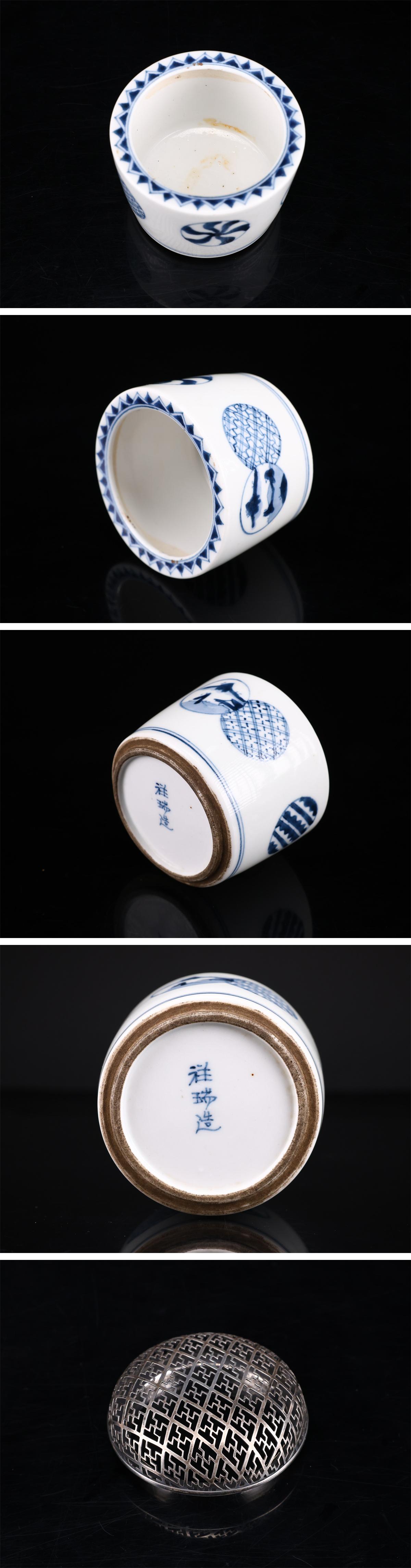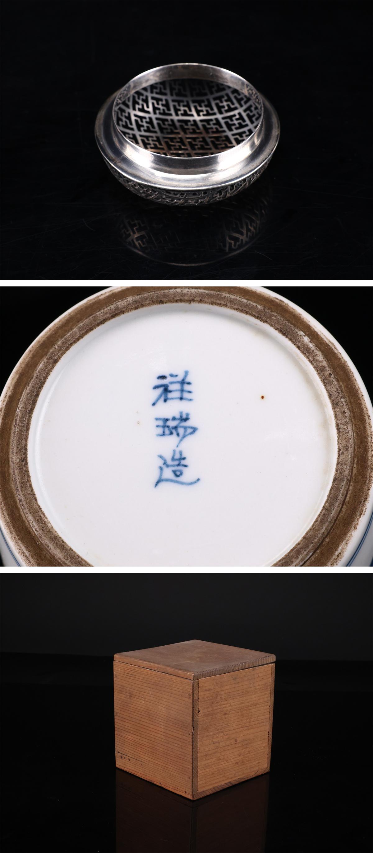 【吉】CP165 唐物 【明代祥瑞造】 青華 香炉 純銀火屋40g付/箱付 美品Ng! 收藏