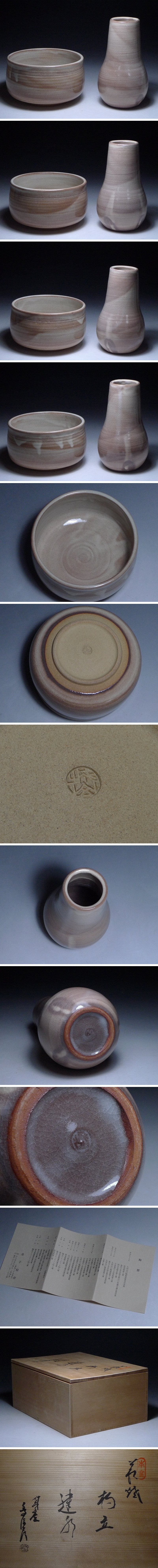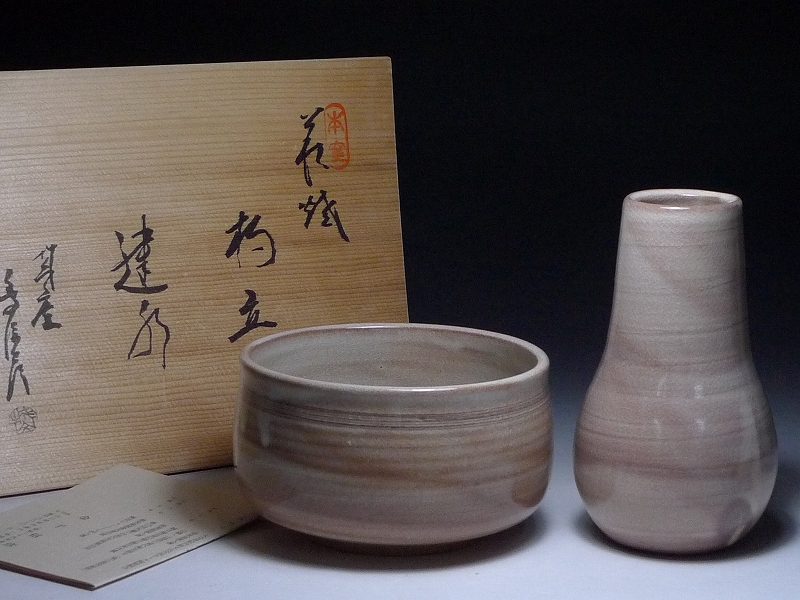10MK206★萩焼・城山窯 金子信彦造・杓立 建水・共箱 栞付き・茶道具 煎茶道具 陶磁器 伝統工芸 古美術 1000-2255 收藏