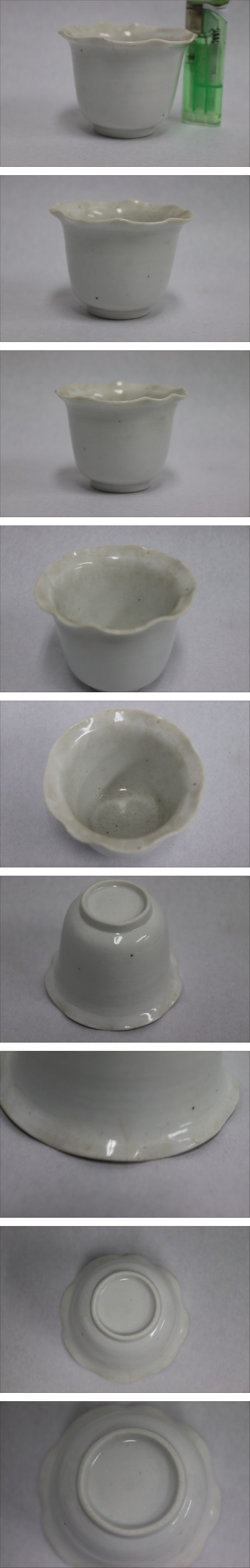 | 商品説明 | 商品名 江戸前期 古伊万里 白磁 輪花 蕎麦猪口 付属品:なし。 サイズ:高さ6.7㎝、口径8.7㎝、底径4㎝。 状態: 薄い僅かなニューが一箇所ございます。 |