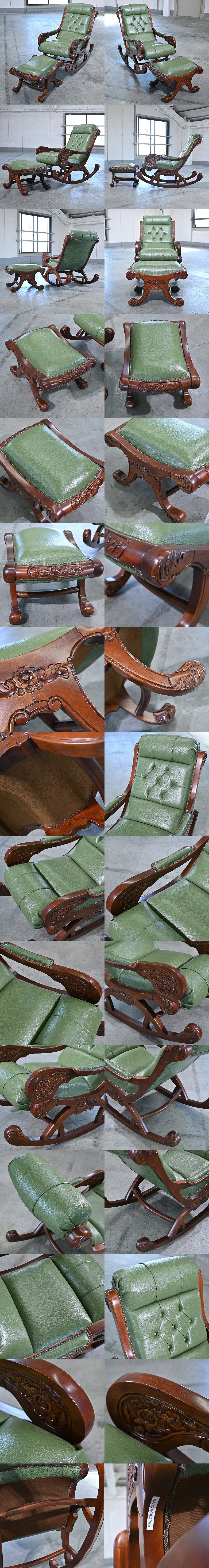 イタリアンビンテージ風 35万「クラシック」ロッキングチェア オットマンセット マホガニー材 無垢 本革 鋲 アーム 書斎 アンティーク調 收藏