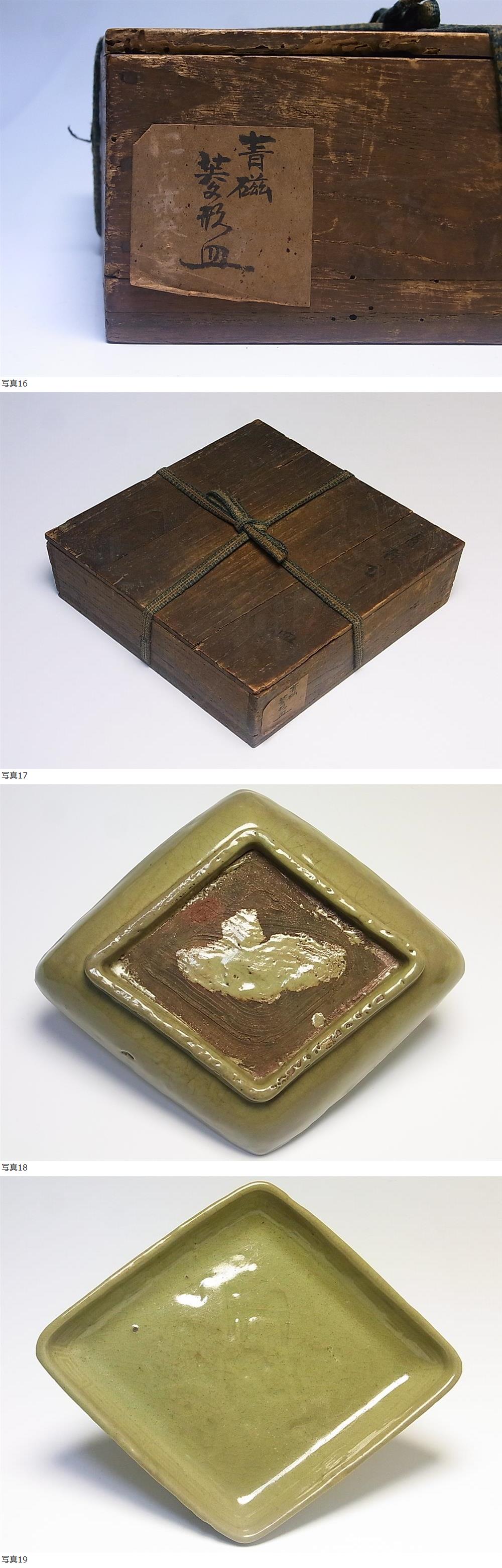 『青磁人形手菱形皿 時代仕立箱付 龍泉窯 元~明時代』の出品です。