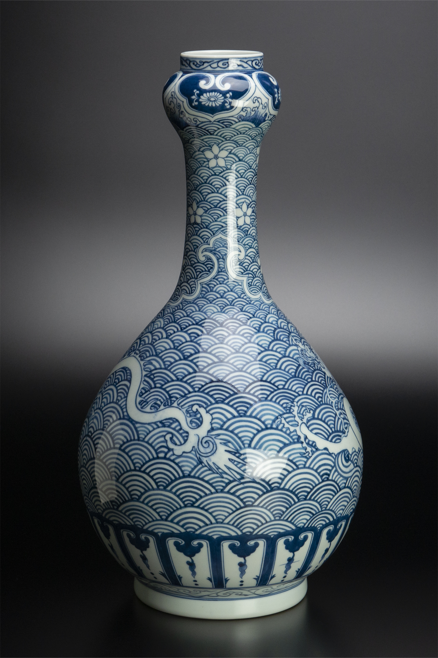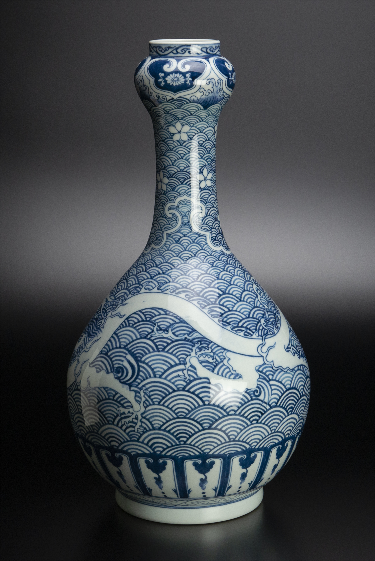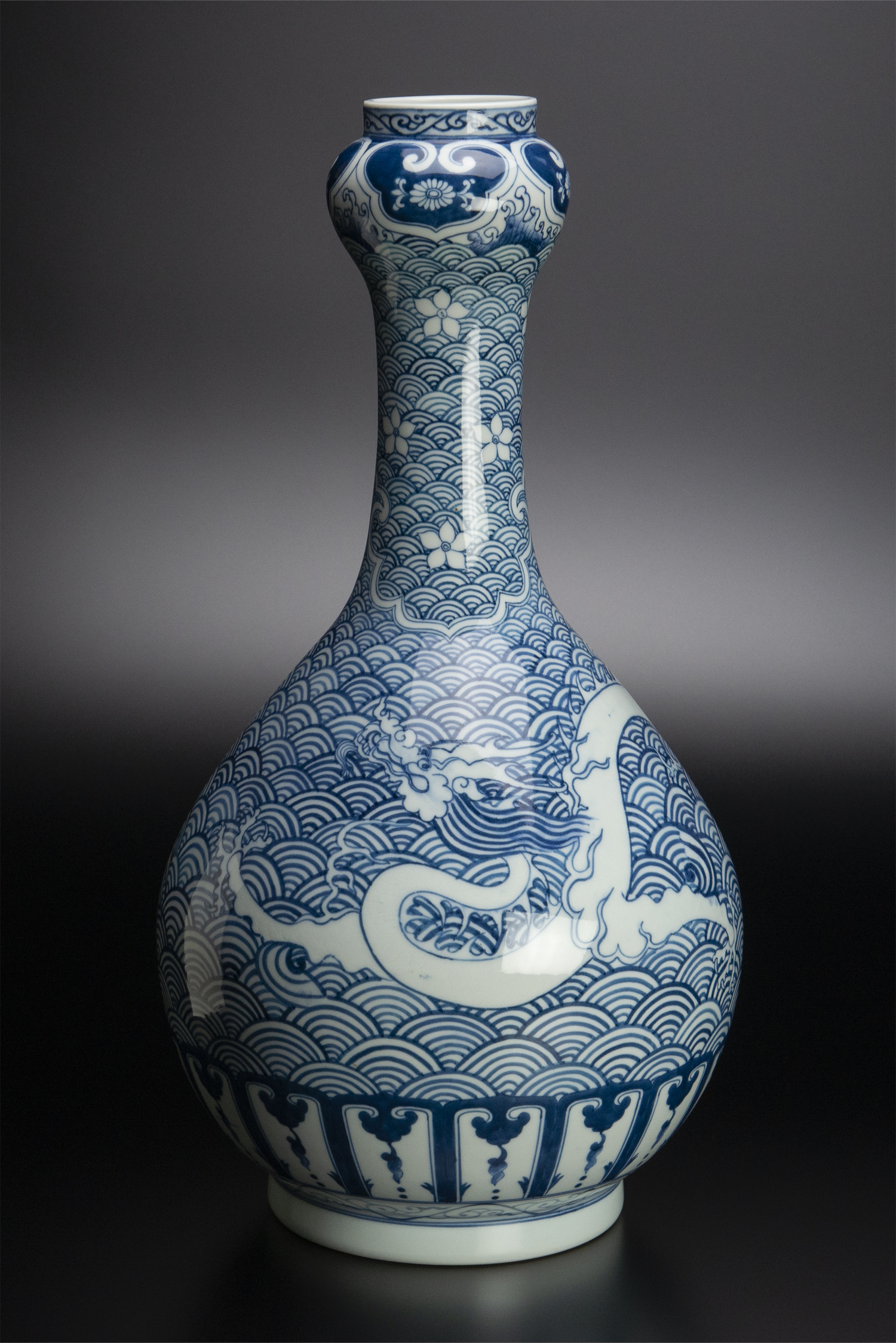 清 青花海水龍紋蒜頭大瓶 大明宣徳年制款 共箱 中国 古美術 收藏
