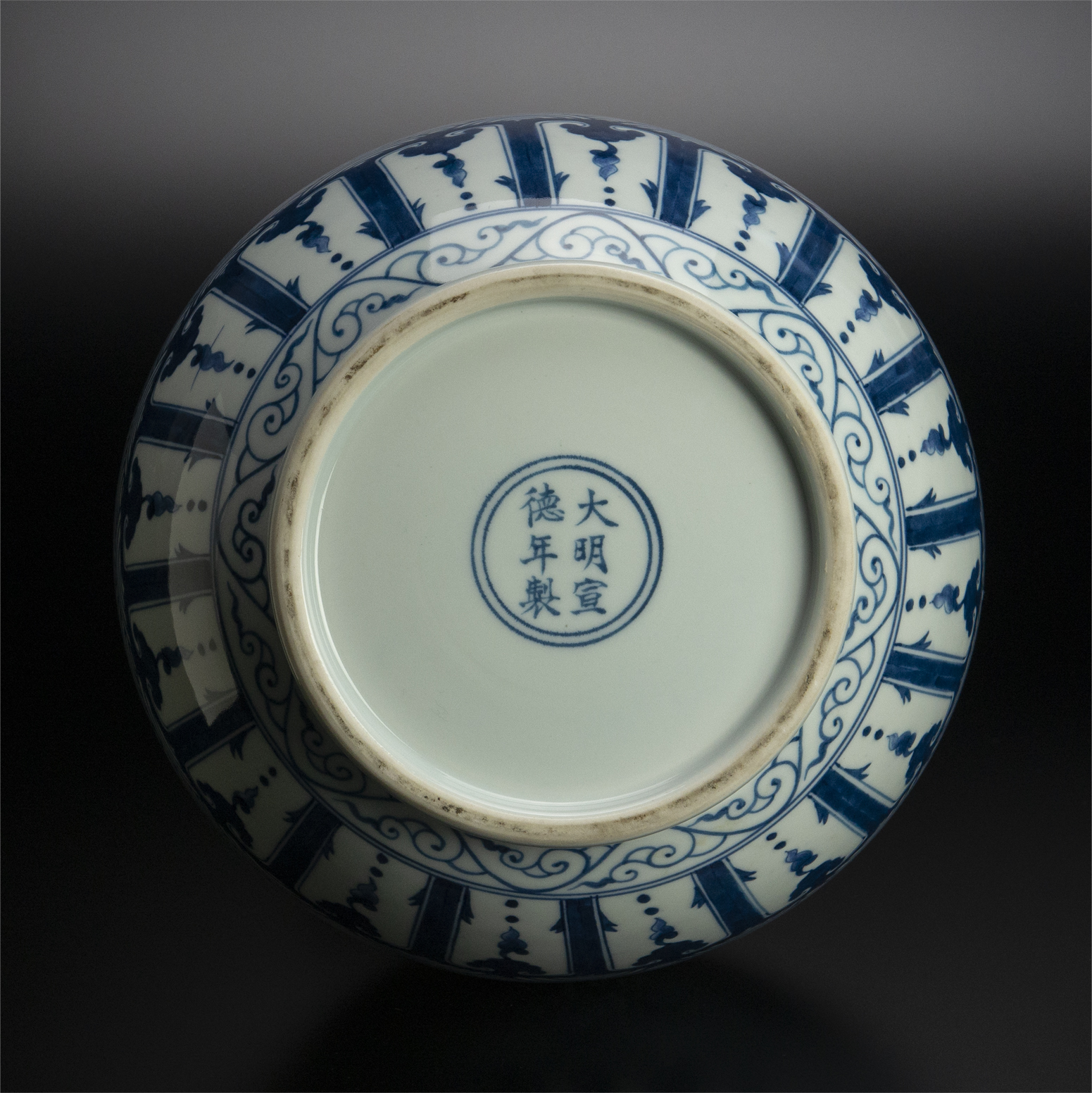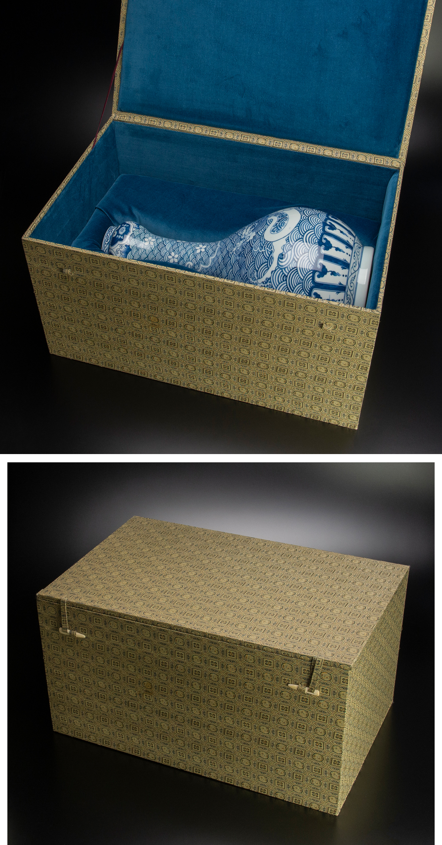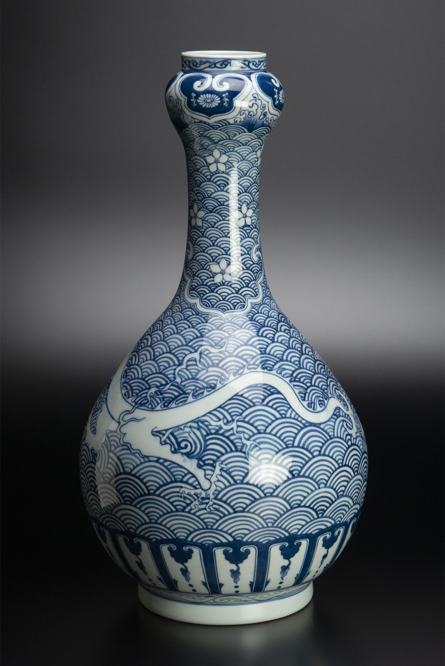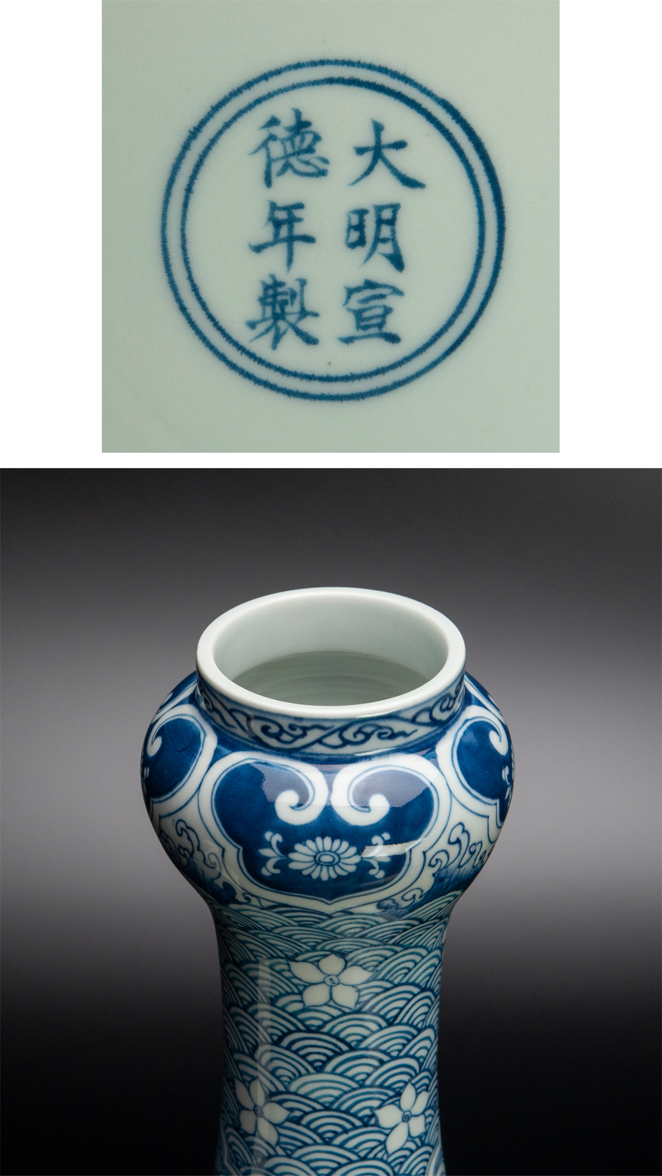 清 青花海水龍紋蒜頭大瓶 大明宣徳年制款 共箱 中国 古美術 收藏