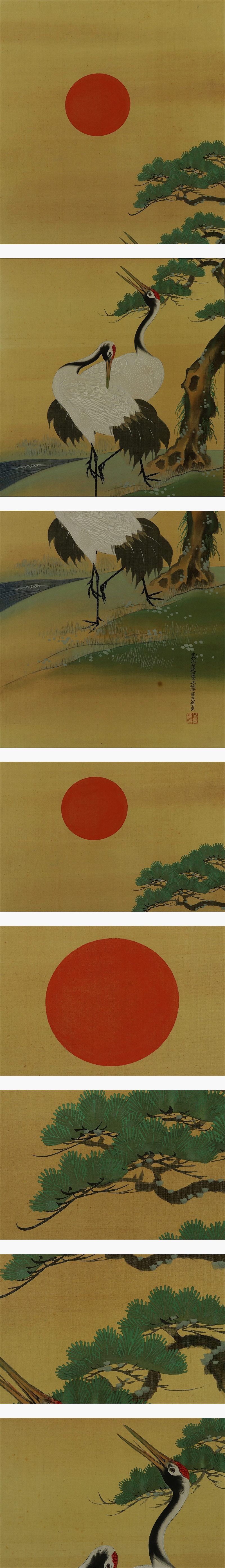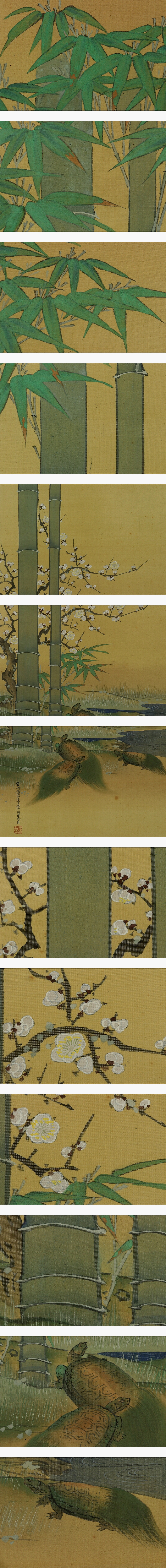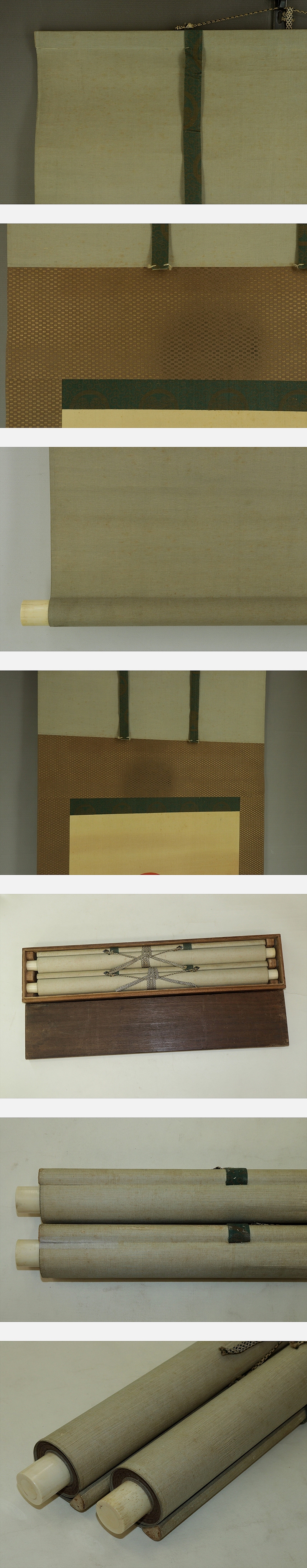 土佐光貞 とさ-みつさだ(1738-1806) 江戸時代中期-後期の画家。 元文3年7月9日生まれ。土佐光芳の次男。土佐光淳の弟。 宝暦4年分家して,宗家の兄と共に絵所預となる。 寛政2年の内裏造営の際,宗家の土佐光時を助け,障壁画の制作にあたった。号は廷蘭。 文化3年2月4日死去。69歳。 本紙は、染み、汚れ、軽い折れ、皺があります。 表装は、染み、汚れ、折れ、皺、虫食い、破れ、ほつれ、修理痕、くすみ、軸先ひびがあります。 【サイズ】 作品 横約41.5cm×縦約110m 表装 横約54.5cm×縦約191cm |
