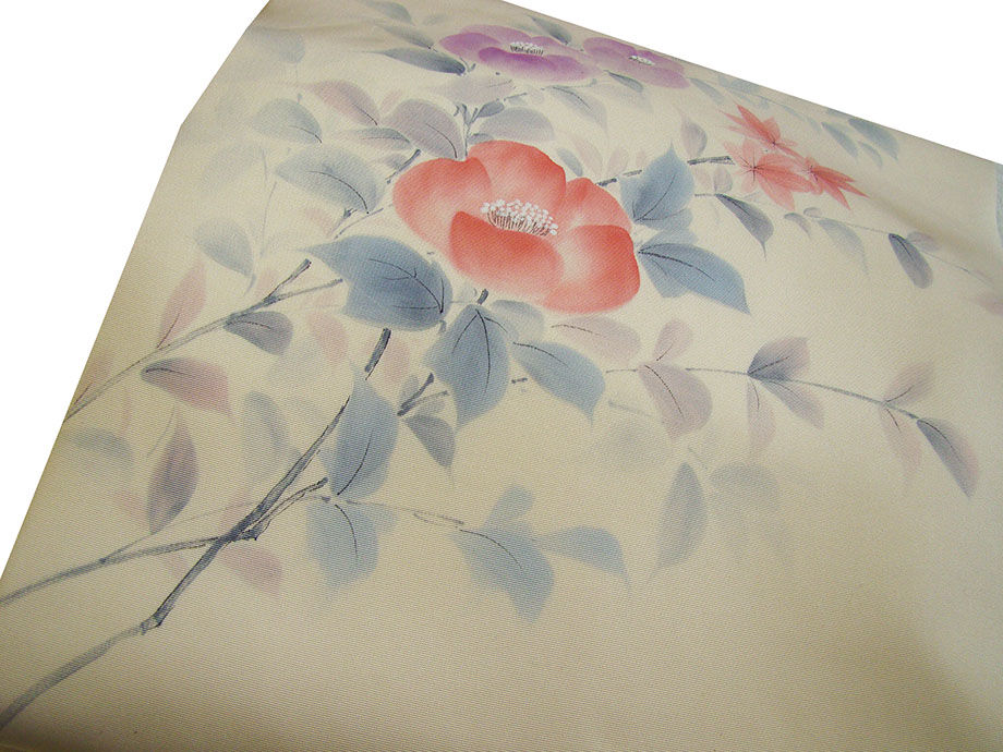 淡いクリーム色地にグレー、臙脂、藤色等の手描きの花柄。作家物。