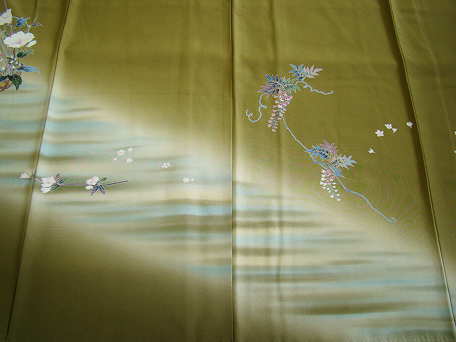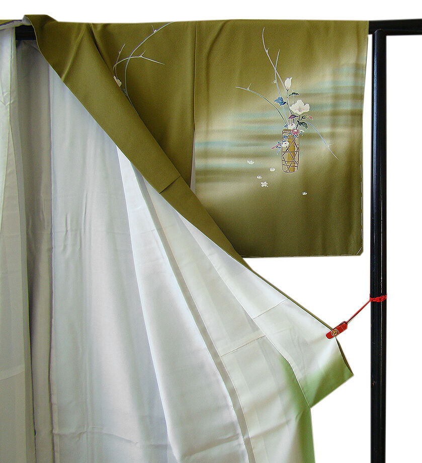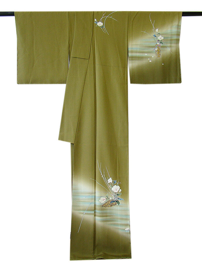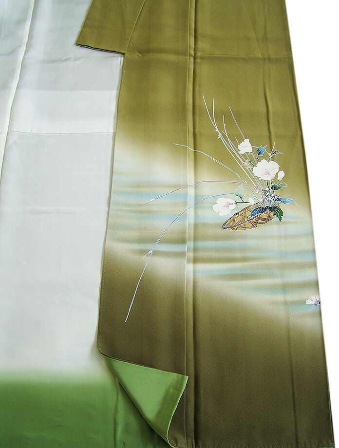 | 商品説明 | こちらのお品は「袷」ですので10月から5月までお召頂ければと思います。 大変にしなやかで柔らかな手触りの着心地良い上質な重めの極上ちりめん地の生地、 根岸色地に裾にかけて璃寛茶色ぼかしに、象牙色や水色等の横断のぼかし染に 花籠文や花草柄の本加工染、 丁寧かつ細やかな染め上がりで、お着物の品格をよりいっそう絢爛たる美しさで満たす事でしょう。 八掛は苗色(正絹)、幅広い年代の方にお召し頂けます。 |