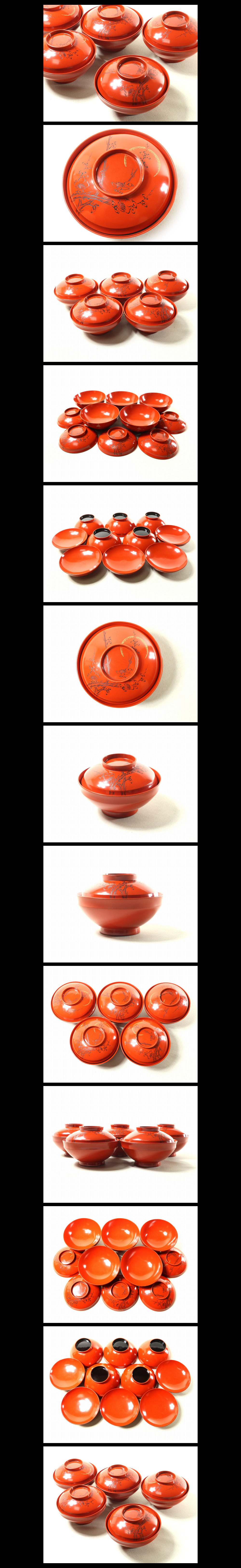 ●c1042●【輪島塗沈金沈黒吸物椀5客 梅月 朱布着堅地】検お茶会煎茶道具茶懐石蓋付椀蒔絵●西瓜●