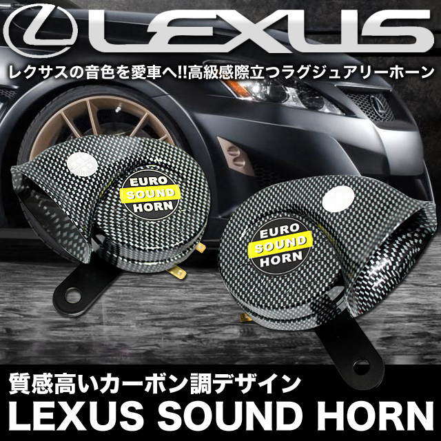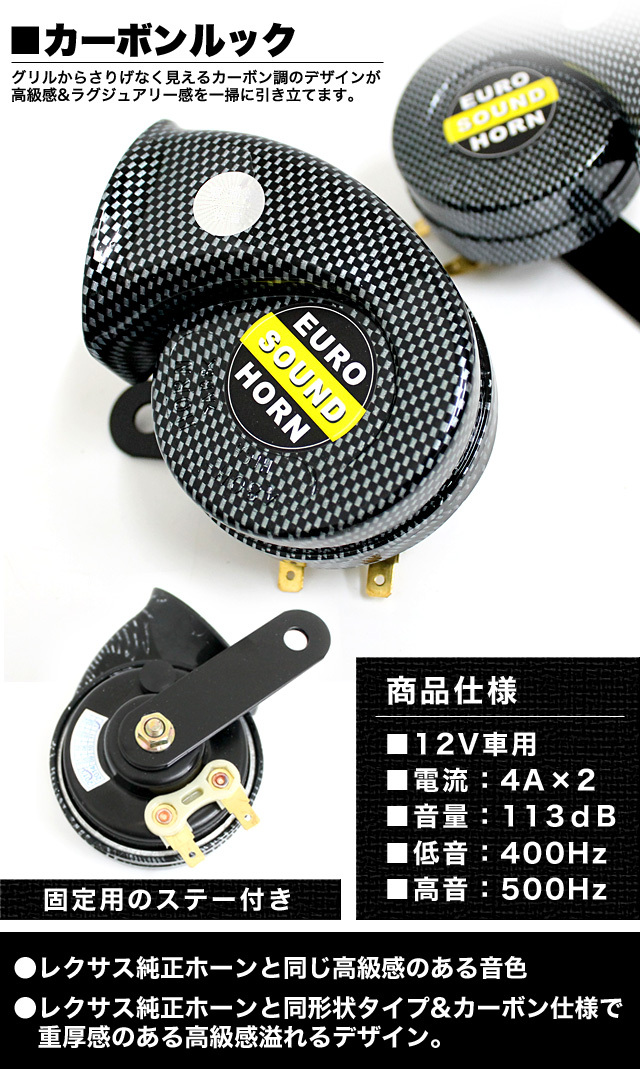 レクサス純正ホーンと同じ高級感のある音色! レクサス純正ホーンと同形状タイプ&カーボン仕様で重厚感のある高級感溢れるデザイン。 ■汎用品 ■セット内容:低音用 1個/高音用 1個 ■12V車用 ■電流:4A×2 ■音量:113dB ■低音:400Hz/高音:500Hz ※レクサス純正品ではございません。 ※取付けの際はホーン開口部を下向きにしてお取り付け下さい。 ※プラス/マイナスの極性はございません。 |