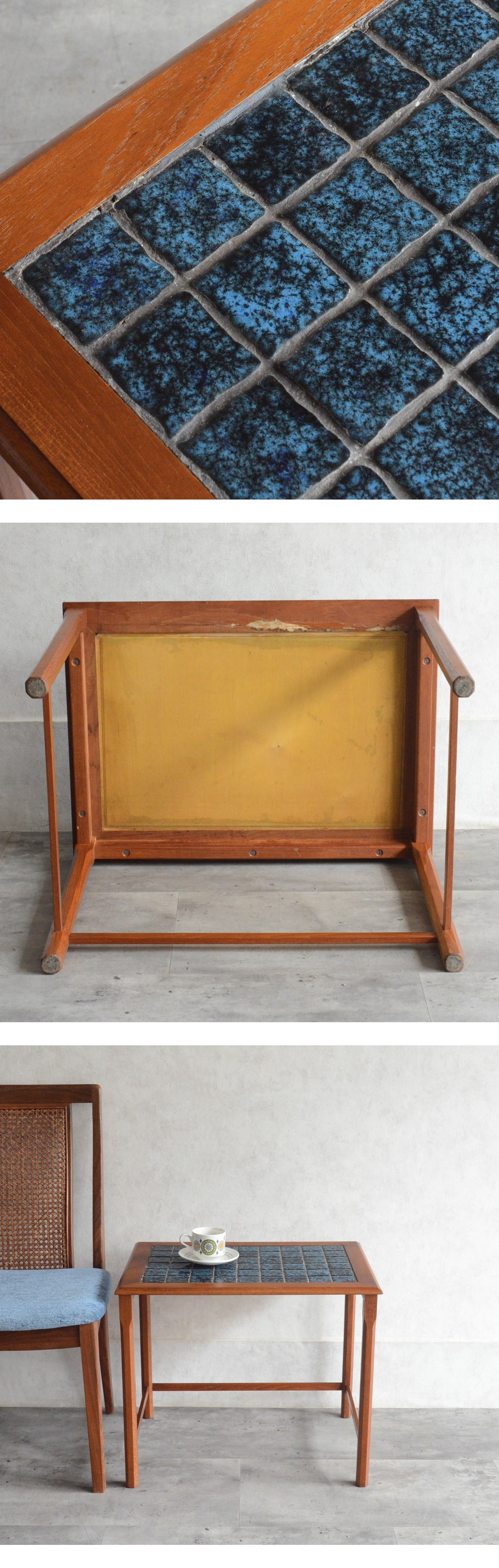 デンマーク 北欧ヴィンテージ ブルータイルトップ チーク ローテーブル 北欧家具 サイドテーブル ナイトテーブル 北欧デザイン 花台 收藏