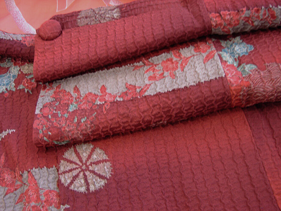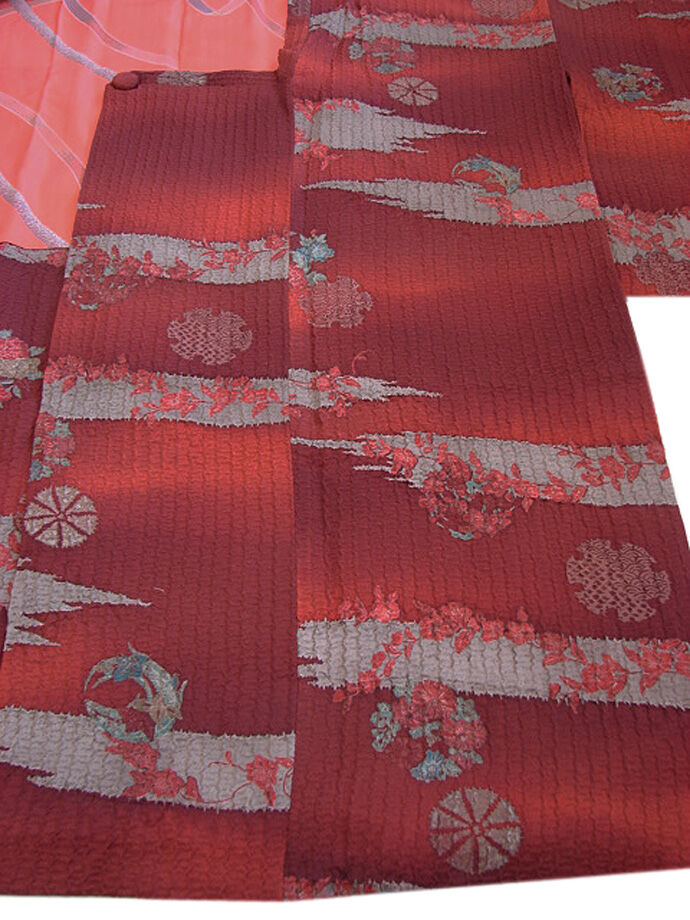 渋い真紅色地にグレー、赤茶、灰青等の染め柄。