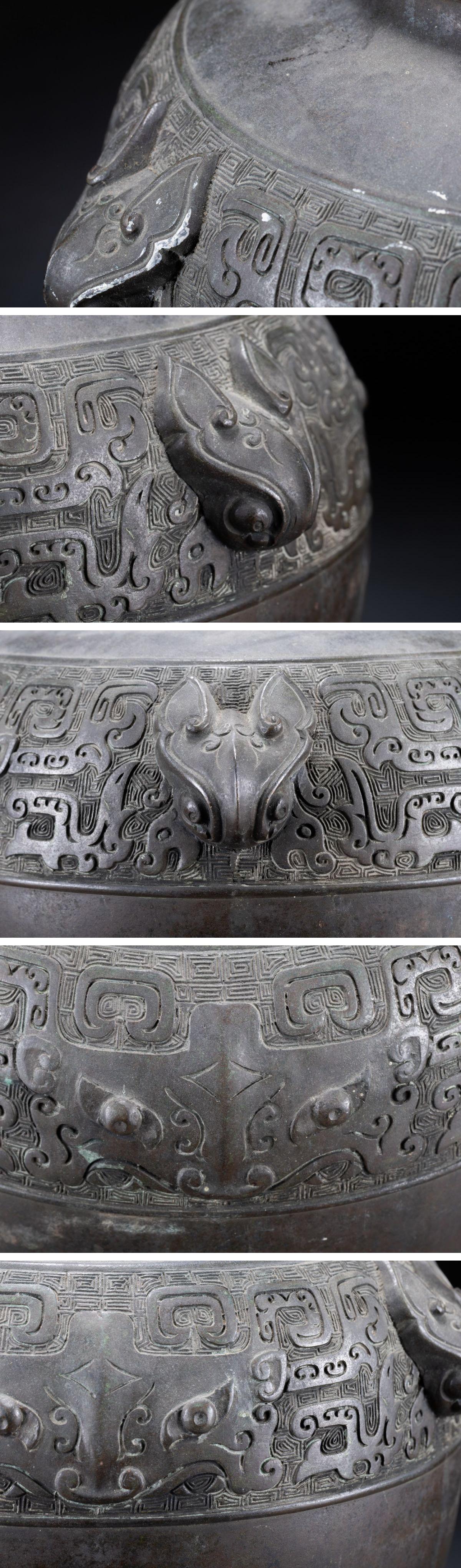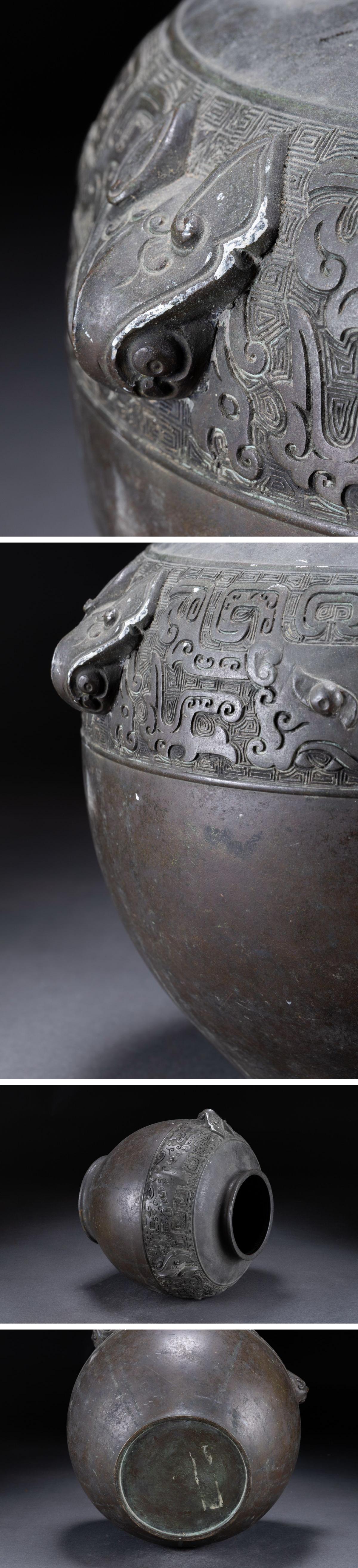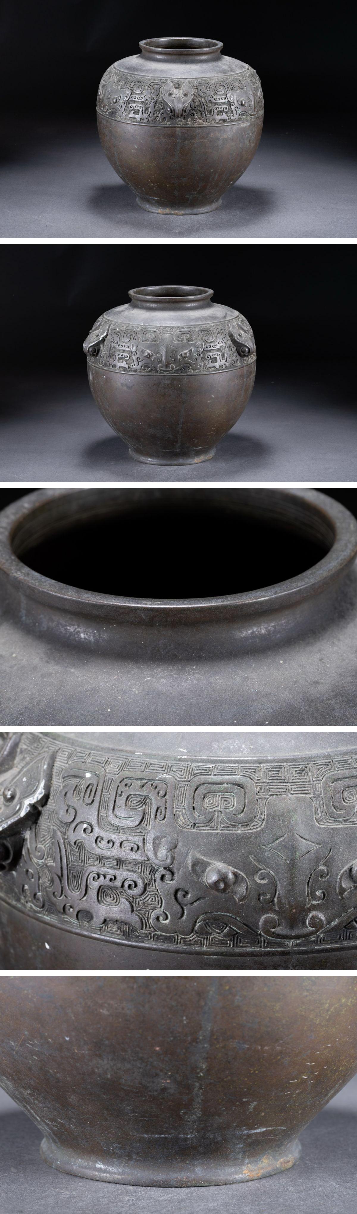 【華】時代舊藏 明治時代 唐銅 獣面紋巨大壺 花入 花生 時代物 古美術 骨董品A25070353-PI 收藏