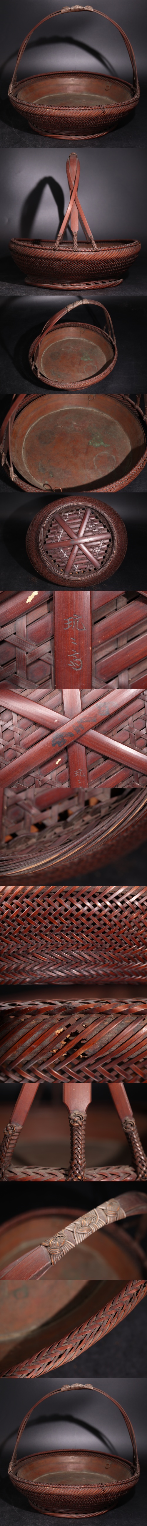 鈴木 玩々斎 造 竹編 手付 盛花籠 / 竹工芸 竹細工 煤竹 花生 花入 掛花籠 籠 煎茶飾 .G2896 收藏
