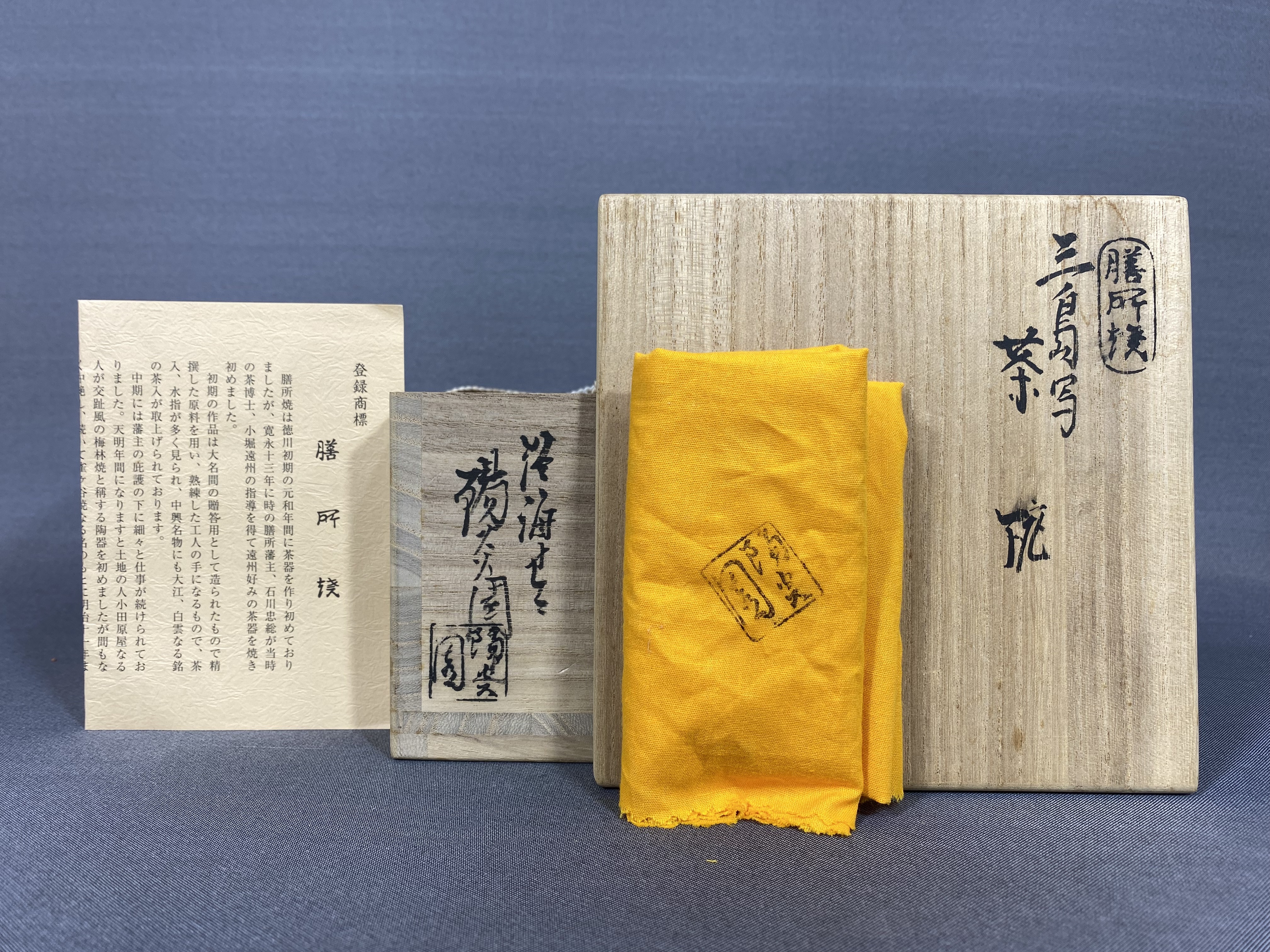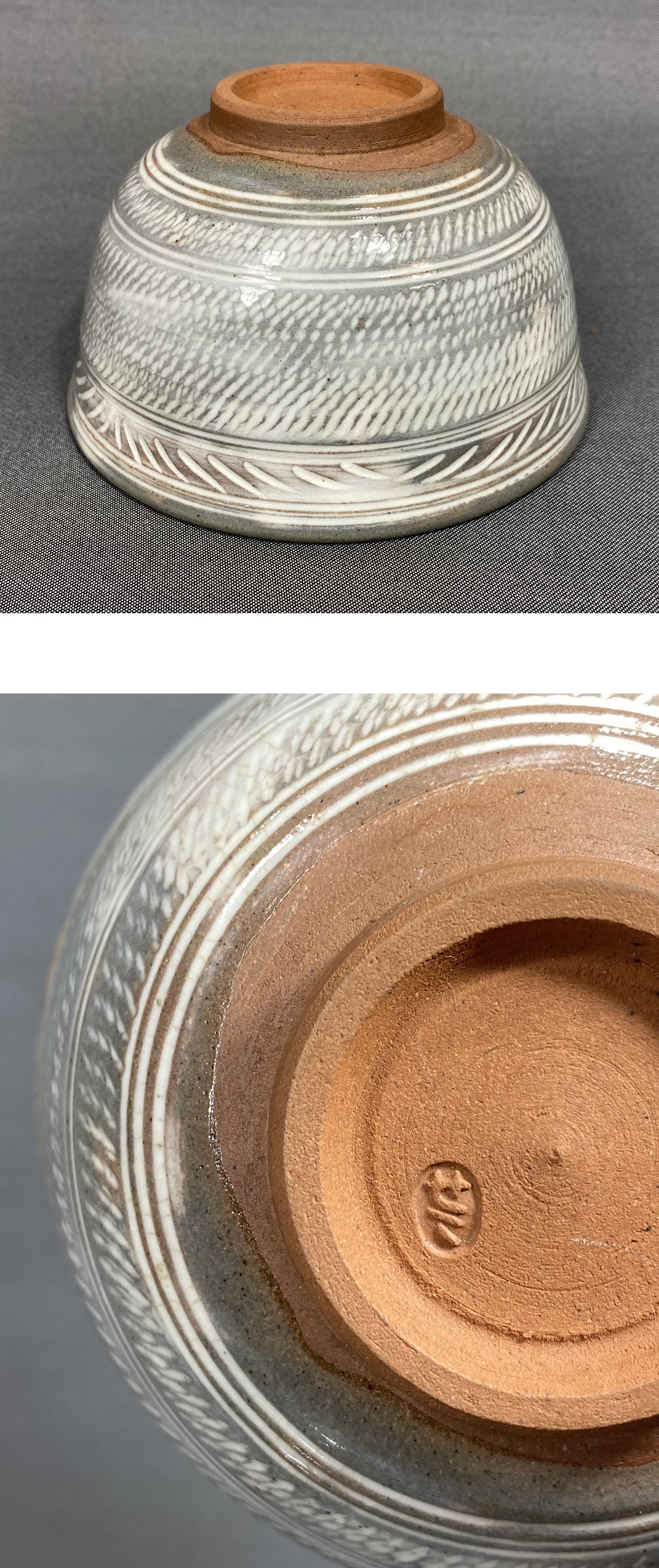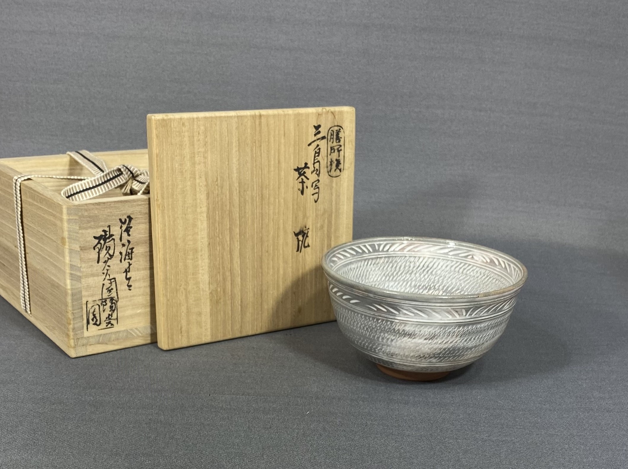 【風車】膳所焼 陽炎園 岩崎新定 造 三島写 茶碗▲共箱 共布 栞/陶歴▲遠州七窯 茶道具 未使用 煎茶道具 煎茶碗 收藏