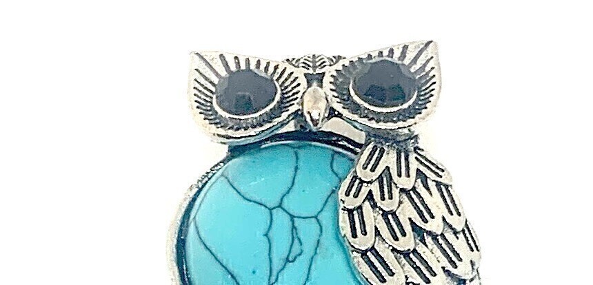 ぷっくりお腹、パッチリお目めの可愛いふくろう(不苦労)ペンダントです。勇気と未来のターコイズ(ハウライト)。サイズは45ミリ×35ミリ、しっかり存在感があります