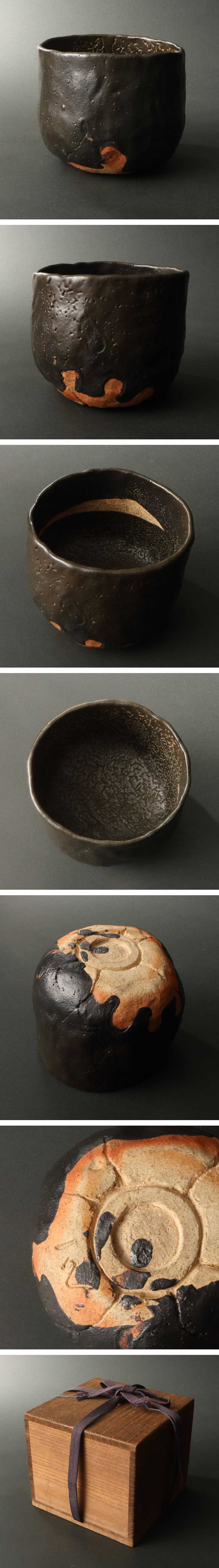 委託HK◇岡本一久(銀座伊勢半、呉服商) 手造瀬戸黒筒茶碗 荒川豊蔵窯の作、共シール(茶道具 陶磁器 陶芸 美濃焼 瀬戸黒 黒茶碗 筒茶碗) 收藏
