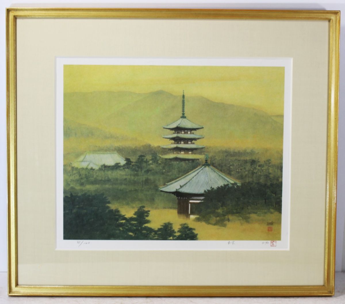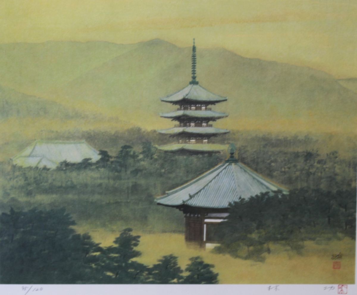《手差し平版印刷》★林 功【古都の朝陽】直筆サイン.額装*日本美術院*シェル美術賞*山種美術館賞.優秀賞*塔.夢殿*千葉.物故*[桃] 收藏