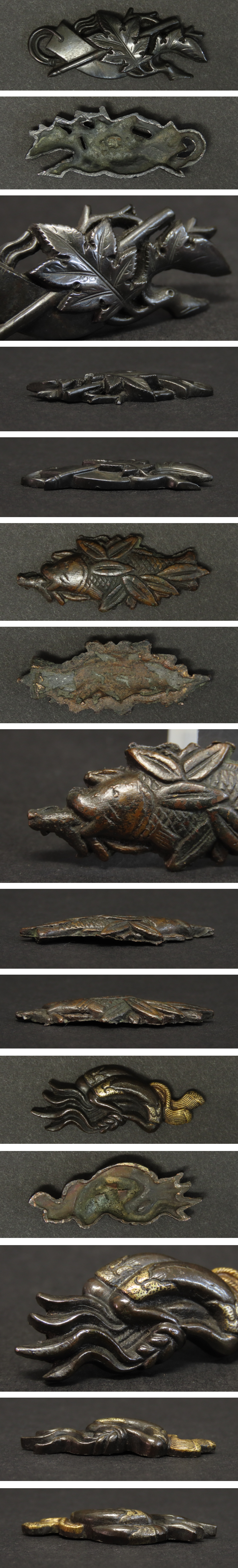 【月】【目貫 縁頭 特集070】銅地目貫3点 草木図 鯉の図 金象嵌 / 刀装具 武具 刀剣 金工 鉄鍔 收藏