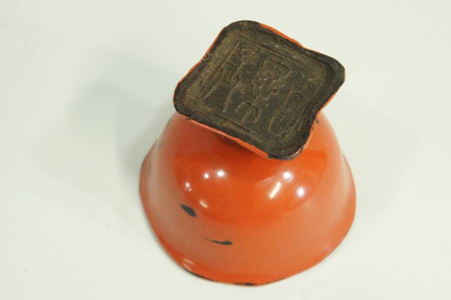 底部に印影が掘られている根来塗の酒盃です。