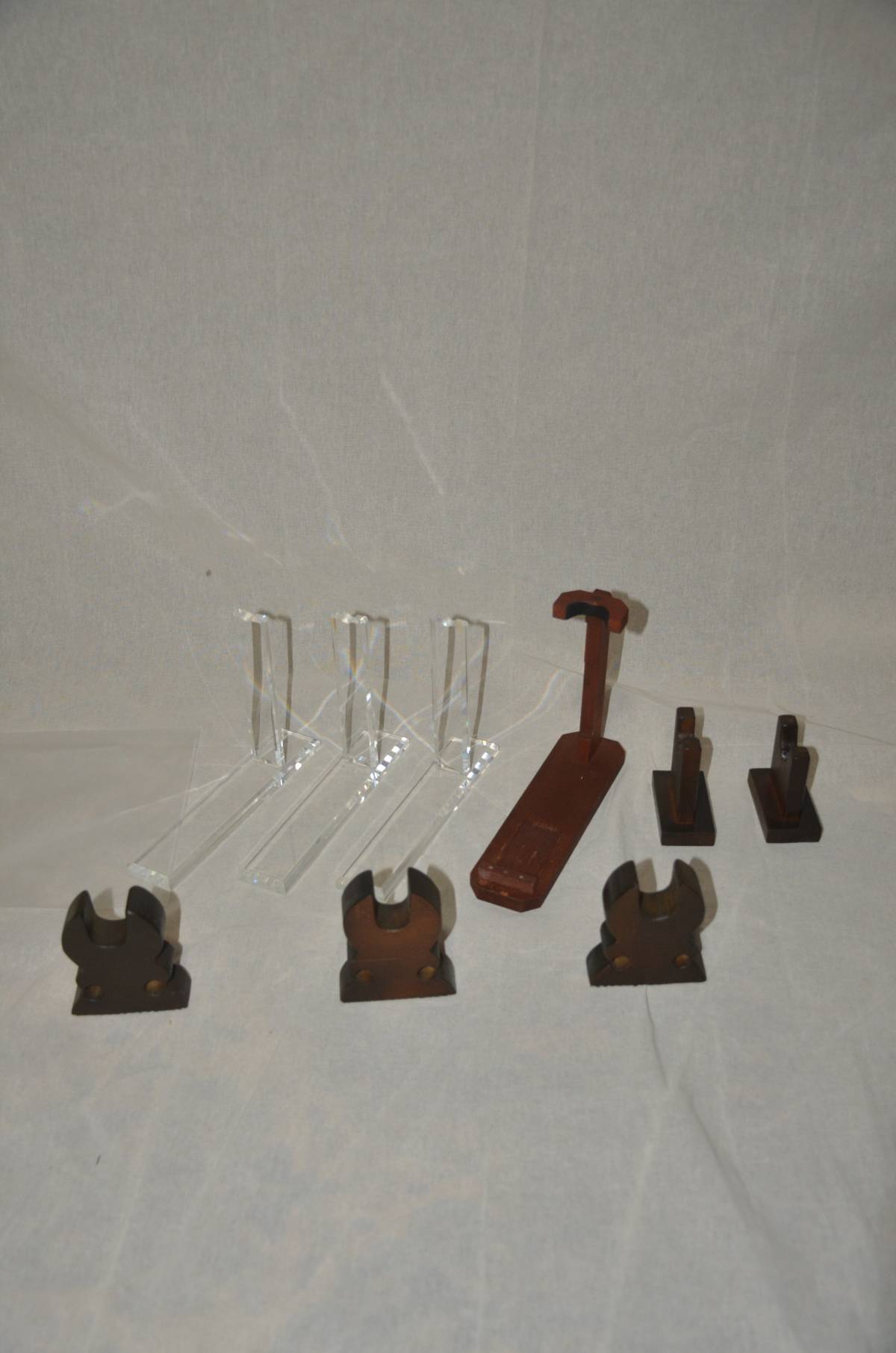 モデルガンの置き台と思われます。御依頼品なので、模型用の可能性もあります。アクリル製の物は、台部4センチ×15センチ×高さ5センチです。ただ、グリップの滑り止めが無いのと、上部の幅が1センチしか無いので、模型用の可能性もあります。可能性として、SAAの可能性もありますが、不明です。3点あります。木製の台部5.5センチ×21センチ×高さ16センチです。上部の幅3センチです。木製の置き台は、台部7.5センチ×4センチ×高さ7.5センチです。上部の幅3センチです。2個です。木製の台部7.5センチ×2.5センチ×高さ9.5センチです。上部の幅2.5センチです。3個です。合計9個一括です。本文下の追加写真もご覧ください。ヤマト運輸宅急便で、全国一律700円でお送りさせていただきます。