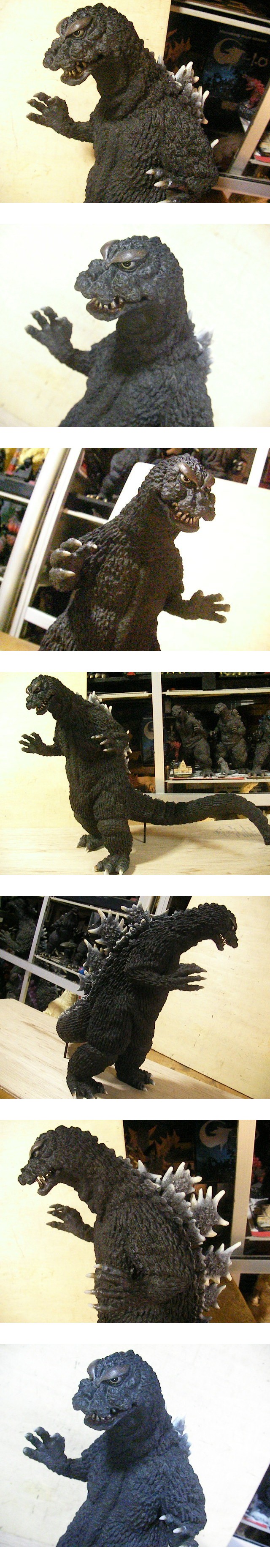 井上雅夫氏原型 ソフビ 頭までの高さ30cm 鼻先から尻尾まで約40cm ゴジラ単体での出品です。国内のガレージキットの存在を一気に世に知らしめた正に第一人者、井上氏の全盛期の作品のひとつ。井上さんと言えばキンゴジ造形が特に有名ですが、このモスゴジも非常に人気が高いキットです。伸びやかなサイドヴューと厳つめの顔が魅力的。ただし絶版品ですので今回は完成ジャンク品を入手して再度作り直しをして完成させました。製作は先ず全体を洗浄後、接着部の殆どをパテ埋めしてつなぎ目は完全に無くしてあります。塗装では劇中に近づけて青黒く見えるよう3段階ほど暗いグレーを分けて塗りました。背ビレはトゲの部分と芯の部分の一部に白系統。手足の爪は根元が汚れた乳白色です。最後に顔周り。口内は設定に寄せて赤黒く、牙は明るめの乳白色です。目の部分は赤黒いアイラインを引いて白目は縁に濁りを入れて中央になるほど明るく塗って三白眼に近い黒目を入れました。実際のモスゴジの目は複雑な構造を持っていますので立体的に見えるよう瞳の位置には気をつけてありますので、横から見ても正面から見ても破綻なく独特のニラミの利いた目になったと思います。30cmサイズのモスゴジを探しているとしたおススメ出来るひとつですのでこのご機会をお見逃しなく!よろしくお願いします。