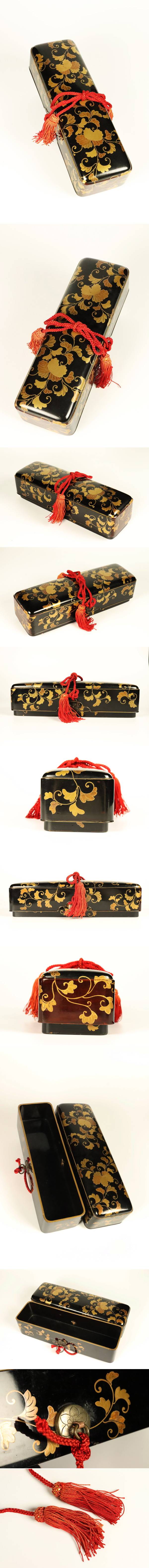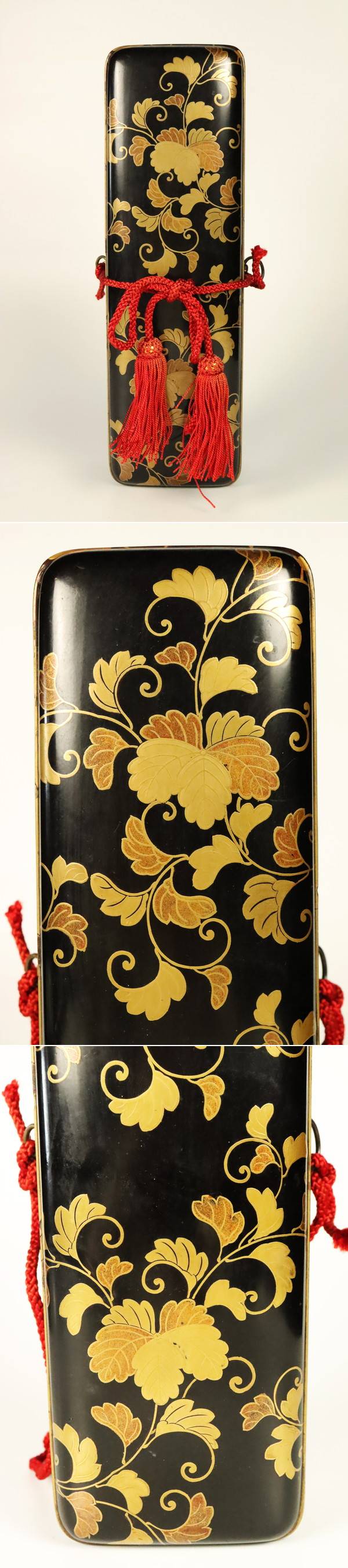 【ASAHI】時代蒔絵 黒漆塗金蒔絵 唐草文 長手箱 文箱 短冊箱 古美術 超絶技巧[711144qp] 收藏