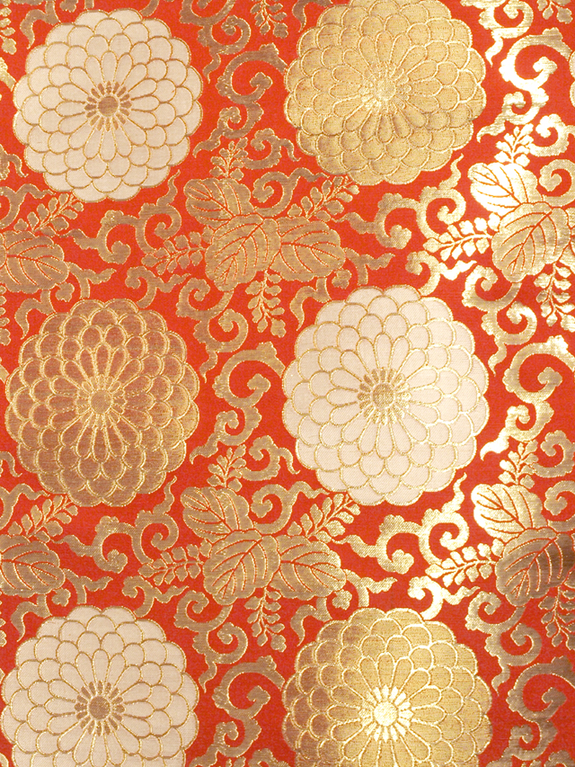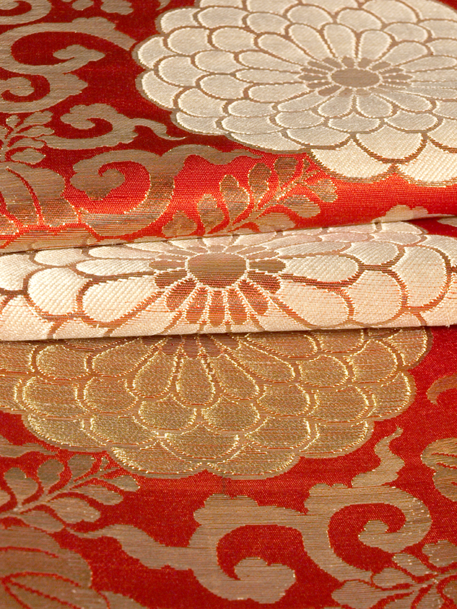 緋(ひ)色の地に、むじな菊唐草の文様が織り込まれた、本金箔の錦織の帯地のはぎれです。丸帯の残布と思われます。 明治末から大正期ごろにつくられたと思われるアンティークのお品です。金銀箔糸がとてもきらびやかで、豪奢な雰囲気です。 残布なので未使用保管品です。下端の柄抜き部分の中央に直径約 5mm のうすよごれが 1 か所ありますが、あまり判別はつきません。そのほかに目につく大きなしみやよごれ、褪色などのダメージはなく、この時代のものとしてはとてもきれいな状態です。布地の力はあります。 |